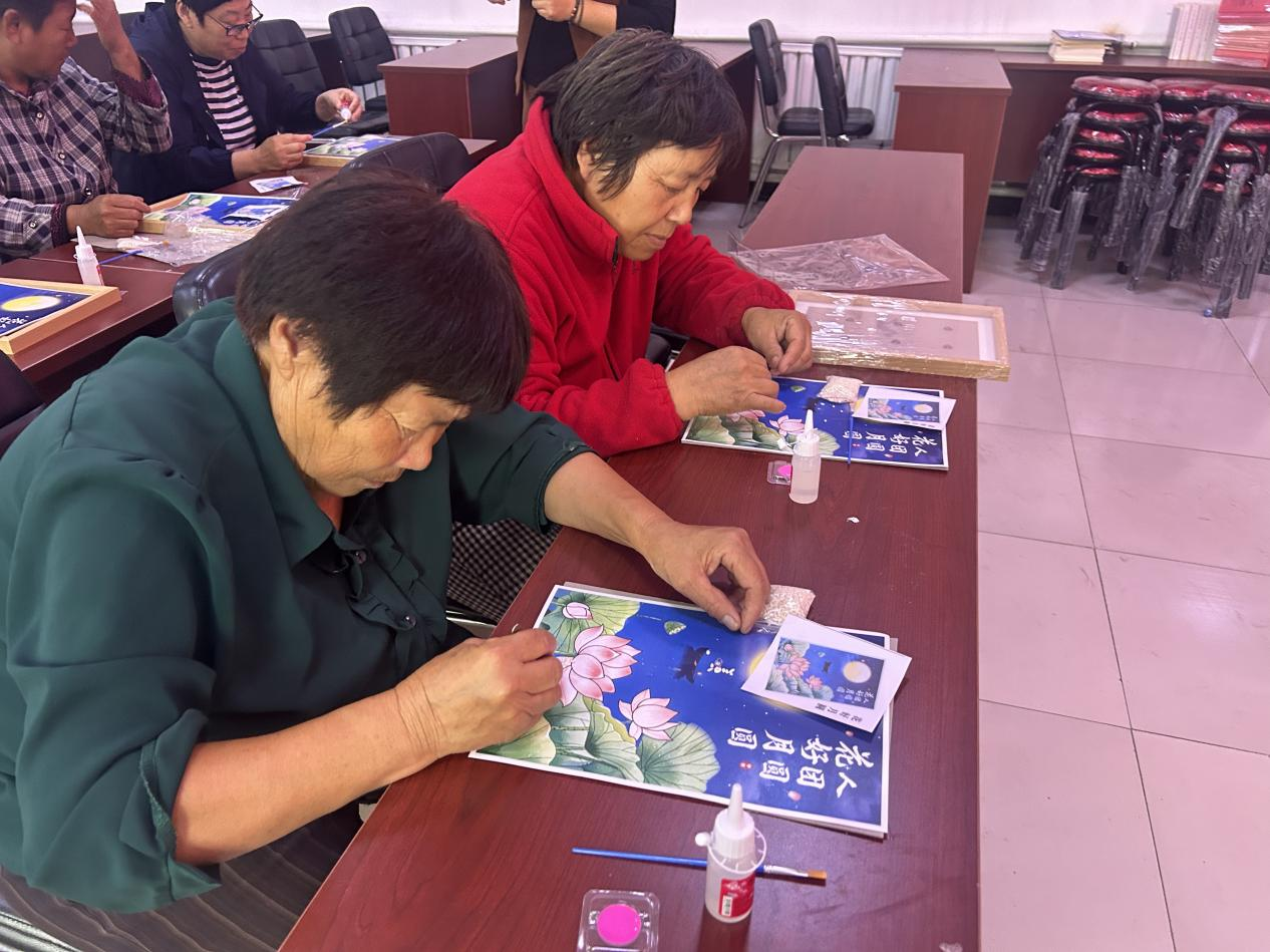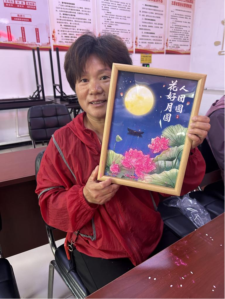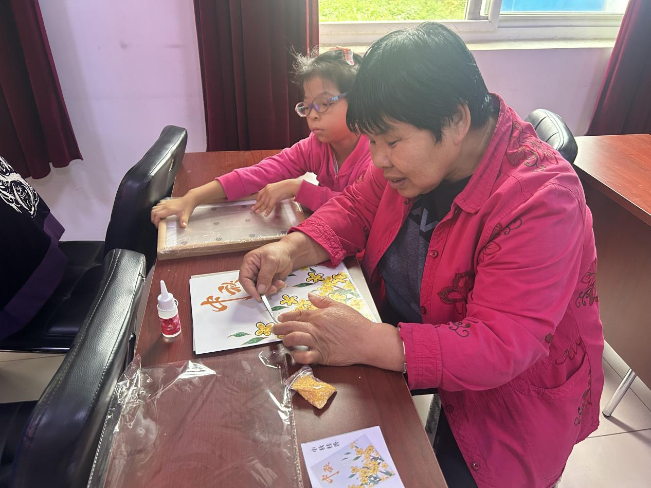 活动伊始,工作人员首先为村民们讲述中秋节的文化内涵,从“赏月寄情”“祭月祈福”的传统习俗,到灯笼象征“照亮团圆路”的美好寓意,让村民们在动手制作前,先深入感受节日背后的文化底蕴。接下来,工作人员向村民们介绍了五谷画的创作流程和技巧。随后,在工作人员指导下,村民们开始认真制作五谷画,一颗颗籽粒饱满的种子“种”在纸上,一幅幅妙趣横生的中秋花好月圆人团圆的画“浮”出纸面,看着一幅幅独具特色的五谷画慢慢成型,大家伙儿都欣喜不已。每一幅画作都承载着老人们对节日的美好祝愿。