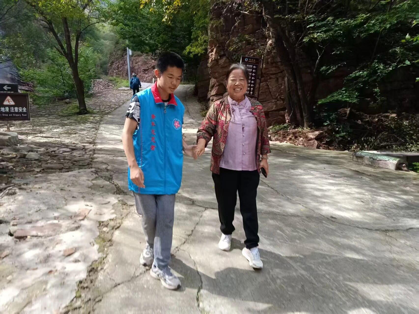 除了环境维护,志愿者们的身影活跃在景区的各个服务点位。在检票入口,他们耐心协助、引导人流;在主要景观前,他们热情地为游客拍照留念,记录美好瞬间;面对老年游客,他们主动上前,提供贴心搀扶与关怀。在党群服务中心,志愿者们更是化身为“暖心管家”,不仅为旅途劳顿的游客们端上热气腾腾的茶水,引导他们休息,还负责接听咨询电话,耐心解答疑问。他们周到细致的服务,让远道而来的游客们感受到了家一般的温暖与便利,赢得了阵阵赞许。