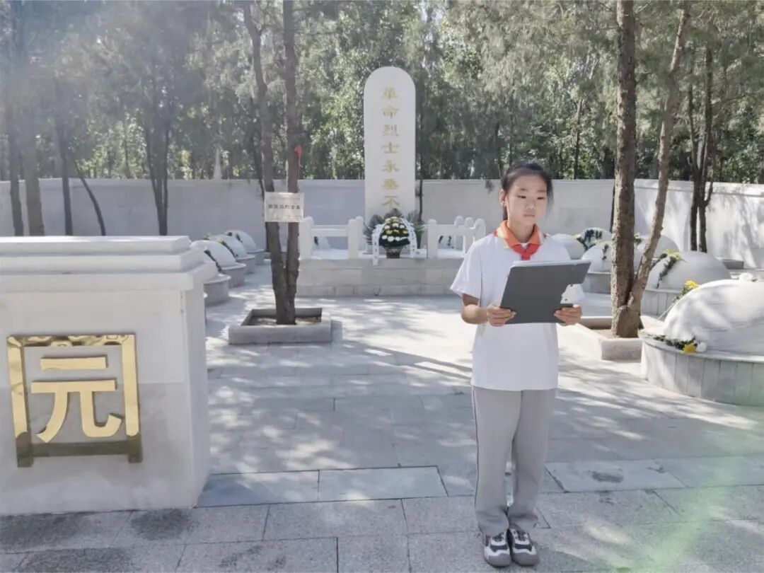 少先队员代表王宇航发言,她讲述了先烈们为国家独立、民族解放奋斗的峥嵘岁月,倡议队员们以先烈为榜样,争做有理想、有本领、有担当的新时代好少年,为祖国繁荣昌盛贡献青春力量。