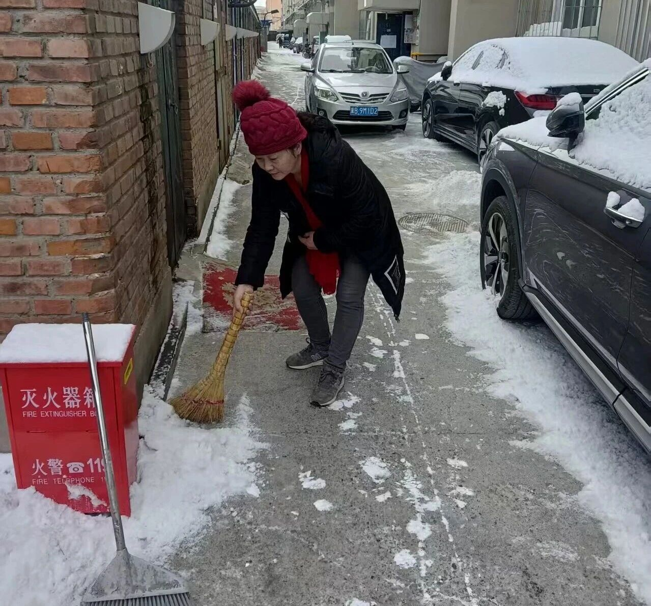 雪后初霁,社区道路上积了一层薄冰,给居民出行带来不便。天刚蒙蒙亮,尉双军就拿着扫帚和铁锹来到小区主干道,弯腰弓背地开始清扫。积雪融化后路面湿滑,她一边清扫一边提醒路过的居民“慢点走,小心路滑”,经过两个多小时的忙碌,她终于为居民清理出一条安全通道,保障了居民的出行安全。