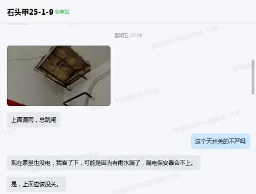 10日22:00多,甲25号楼的一位居民通过微信向包楼网格员发来求助信息:楼顶天井因持续雨水渗漏,积水甚至蔓延至楼道电表箱,导致家中跳闸断电。秋夜寒凉,黑暗中的居民焦急万分,更令人担忧的是,电表箱进水可能引发漏电风险。消息传来,社区工作人员瞬间绷紧了神经 —— 涉及用电安全,一刻都不能耽误。
