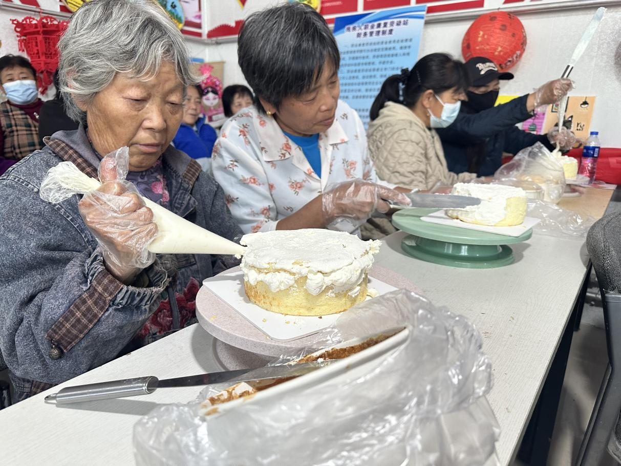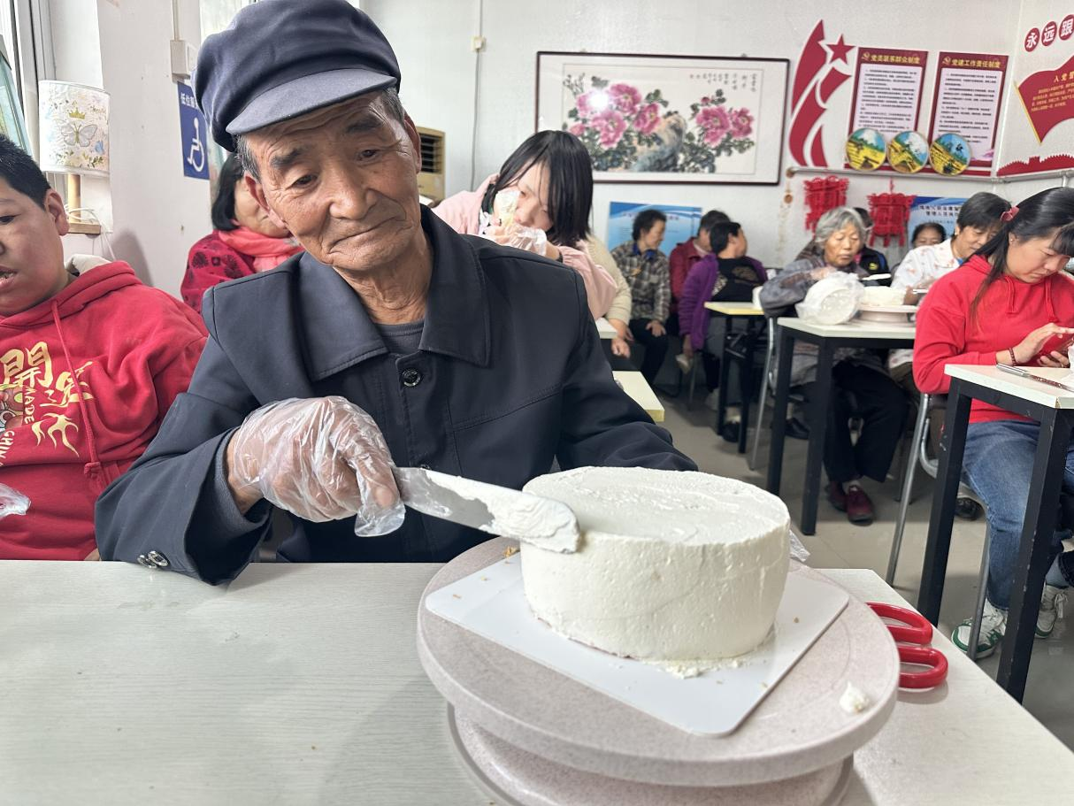 最温馨的时刻当属重阳节蛋糕制作分享环节。工作人员推来定制的节日蛋糕,残疾学员主动为老人分发蛋糕,送上节日祝福。老人们品尝着香甜的蛋糕,脸上洋溢着幸福笑容。此外,学员们还将此前非遗合香珠培训打磨的香珠挂饰、彩色卡纸折叠的吉祥纸鹤送给老人,每一份礼物都饱含心意;部分学员表演的《感恩的心》,更以真挚情感打动在场众人。