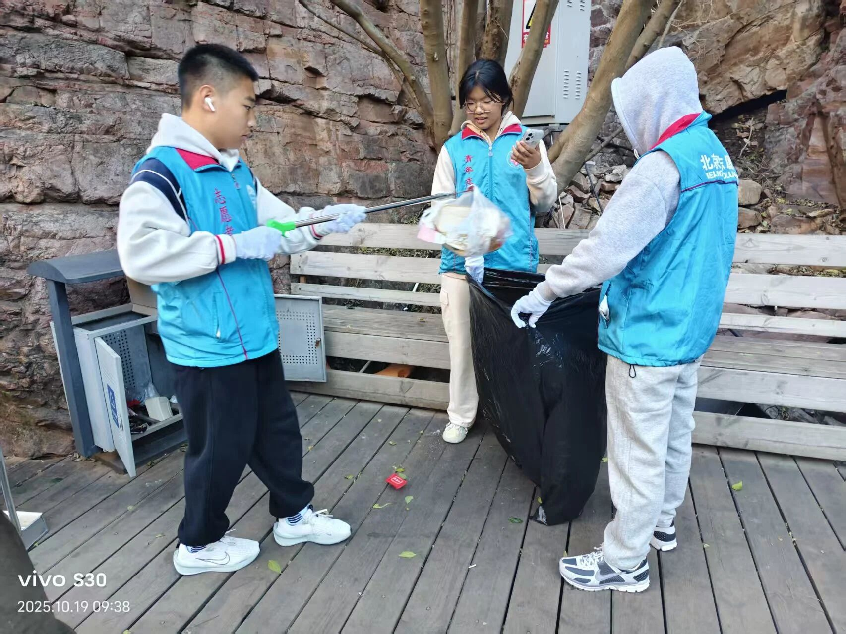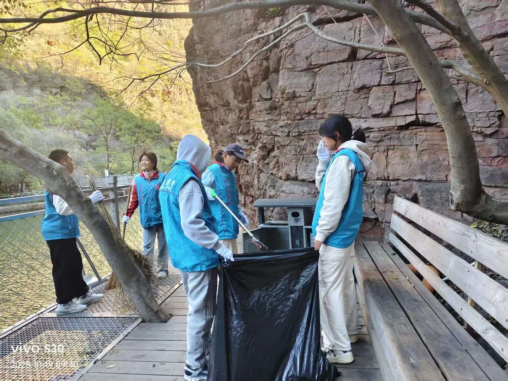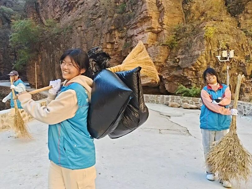 尽管寒风凛冽,但面对景区主干道上堆积的大量落叶,志愿者们热情不减,毅然担任起“清洁卫士”。他们耐心细致地沿途清扫、捡拾垃圾,在恶劣天气中全力维护着景区的整洁与优美。当遇到需要合影的游客时,他们依旧主动上前,热心帮助拍照,用冻得发红的双手为游客定格美好瞬间。那一抹在寒风中坚守的“志愿蓝”,成为了萧瑟秋日里最动人的风景。