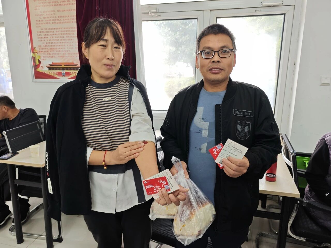献血者们按照新时代文明实践站志愿者指引依次排队,认真填写献血登记表、测量血压、进行血液初筛,确保了血液质量安全和活动顺利进行。采血过程中,医护人员耐心细致地为献血者讲解献血后的护理知识,工作人员还为大家准备了面包等营养补给品。
