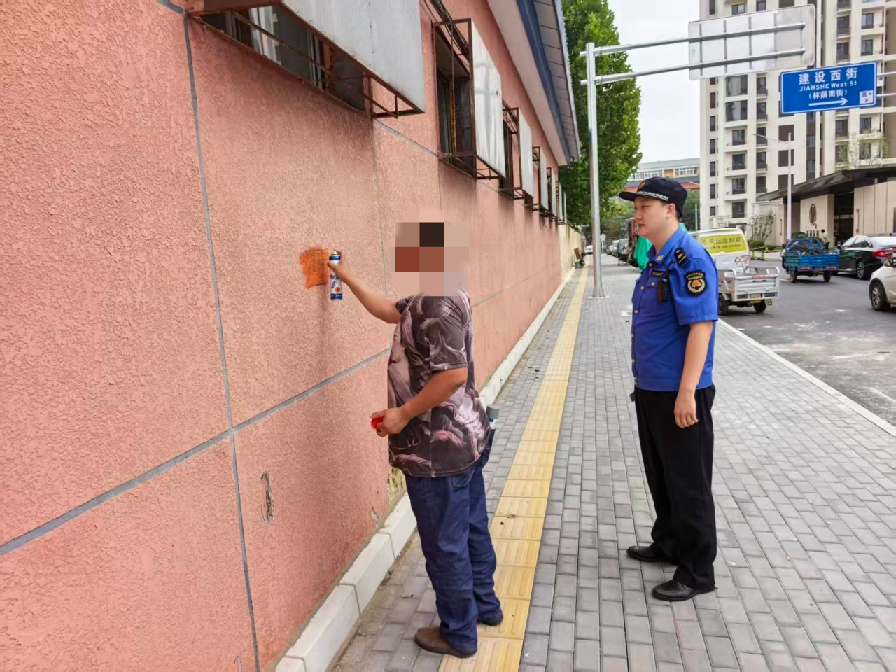 在执法队员的监督下,当事人王某对其张贴的非法小广告进行了清理。