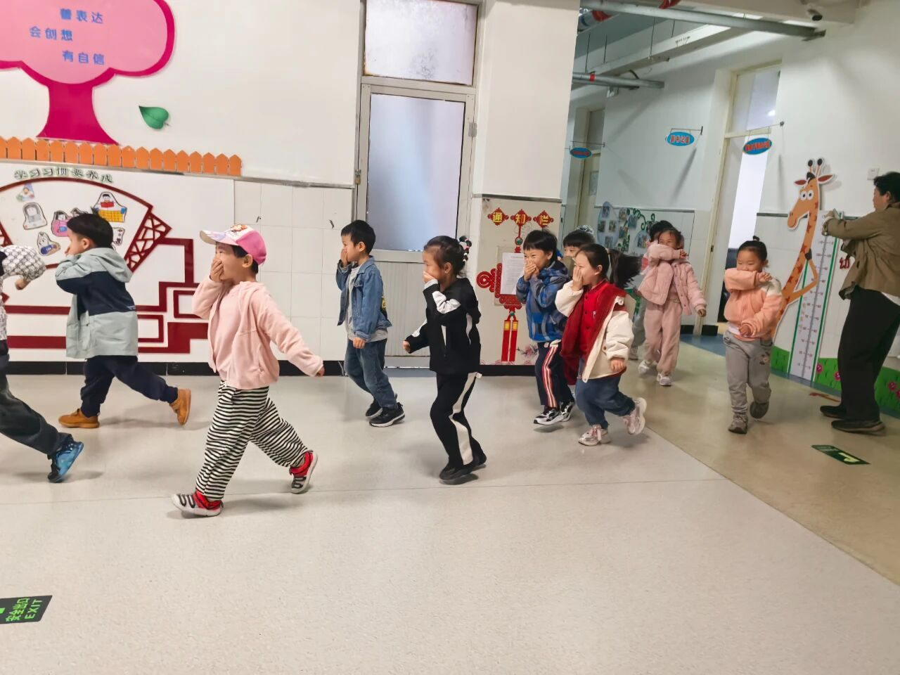 一阵急促的消防警报划破校园宁静,演练正式开始。在老师的引导下,小朋友们迅速弯腰、双手捂住口鼻,沿着预定疏散路线快速向操场安全区域撤离。整个过程秩序井然,全体师生在校园内疏散集结,展现出良好的应急反应能力。