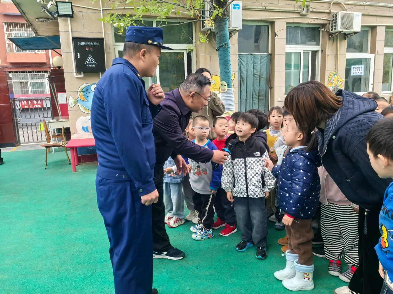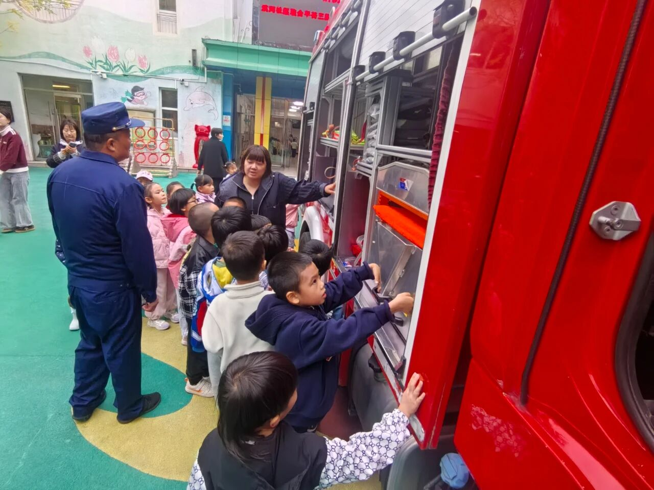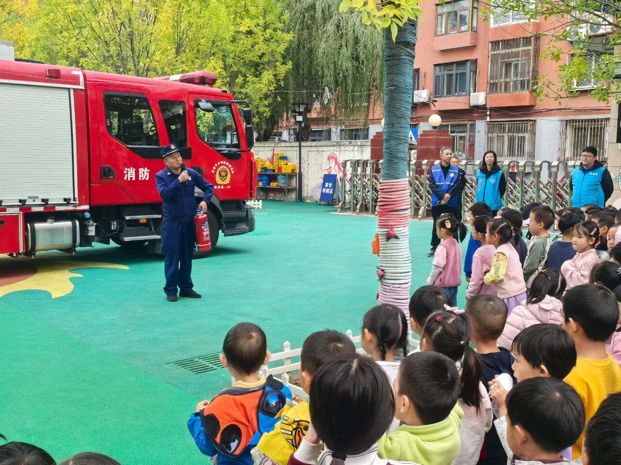 随后,社区邀请的滨河街道微型消防站消防员用浅显易懂的语言讲解火灾危害、逃生技巧,并现场演示灭火器“提、拔、握、压”的使用步骤。面对“着火了能不能躲进衣柜”“消防车为什么是红色”等天真提问,消防员逐一耐心解答,将安全知识融入互动之中。活动最后,消防员带领小朋友近距离参观消防车,触摸高压水枪、试戴消防头盔,让孩子们在好奇与探索中加深对消防工作的认知。