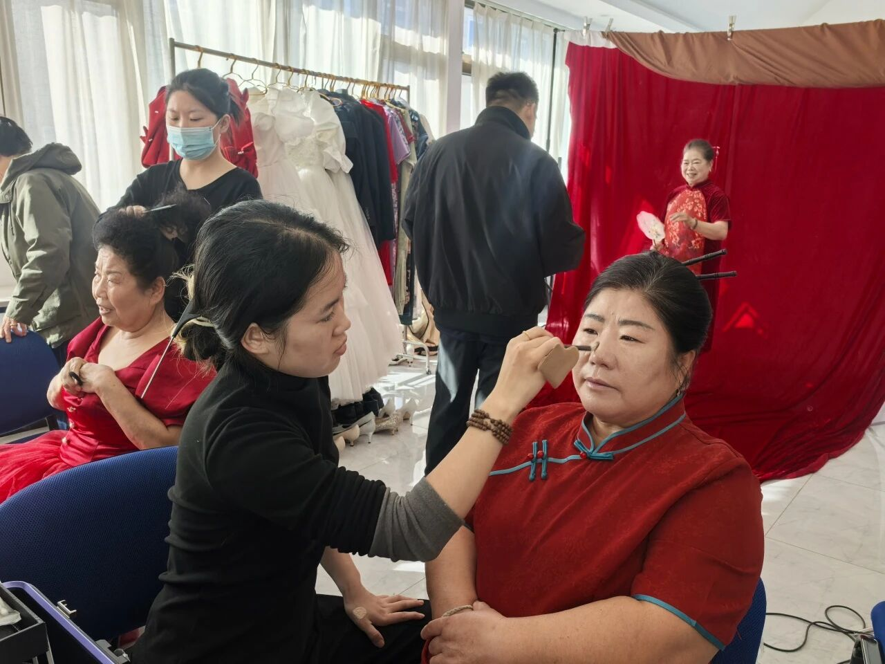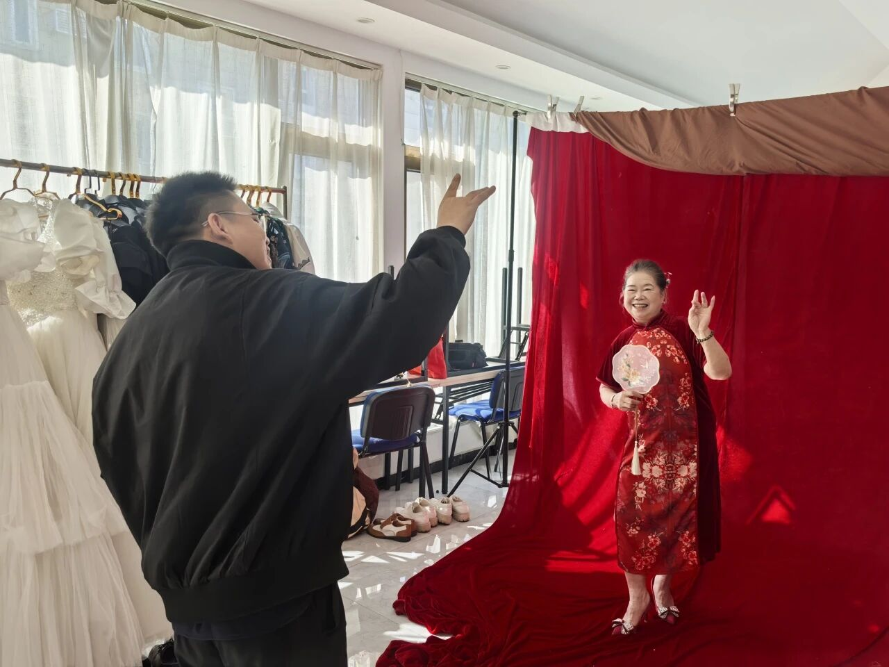 活动现场,专业摄影团队为老人们提供精细的化妆、造型服务,并准备了多套服装以供选择,确保每位长者都能以最佳状态亮相。在志愿者的引导下,长者们或神采奕奕地拍摄个人风采照,或身着婚纱礼服重温美好岁月,现场洋溢着幸福与感动。