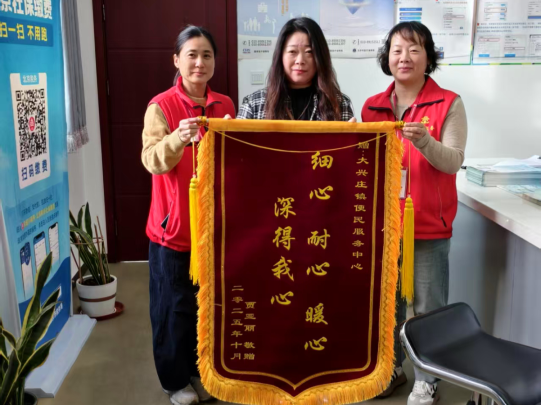 近日,大兴庄镇居民贾女士将一面写有“细心、耐心、暖心,深得我心”字样的锦旗,专程送到了大兴庄镇便民服务中心,对工作人员在其办理业务过程中提供的周到服务表示感谢。