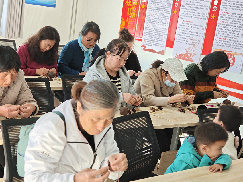 理论讲解后,活动进入了充满创意与趣味的“共暖秋时”手工环节——制作果壳风铃。在志愿者的指导下,居民们利用白老师准备的各类纯植物果壳,发挥想象力,精心搭配。大家细心钻孔、穿线、悬挂,将一颗颗朴实无华的果壳,巧妙地串联成一个个独具匠心、充满自然气息的风铃。现场欢声笑语不断,邻里之情在协作中升温。