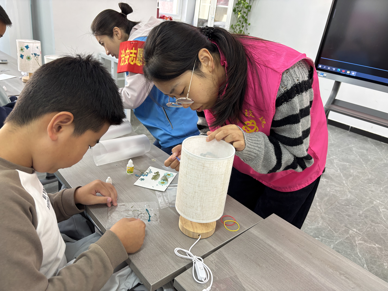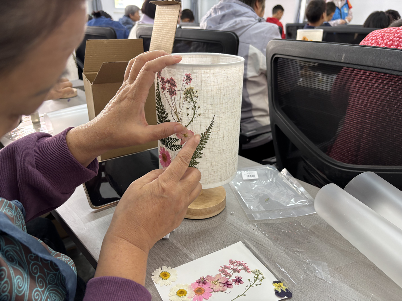 热身结束后,手工压花台灯DIY正式启动。社区提前筹备台灯底座、干花材料包、胶水等工具,工作人员现场教学,详细讲解了干花粘贴技巧与色彩搭配方法。居民们认真学习后,纷纷发挥创意,挑选心仪干花,精心粘贴在灯罩上,打造专属压花台灯。