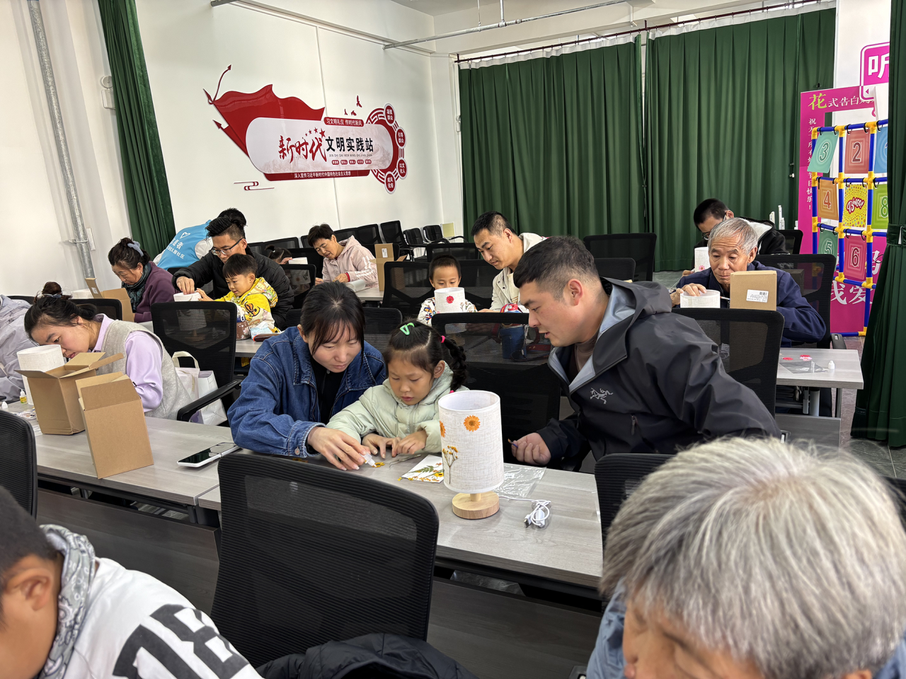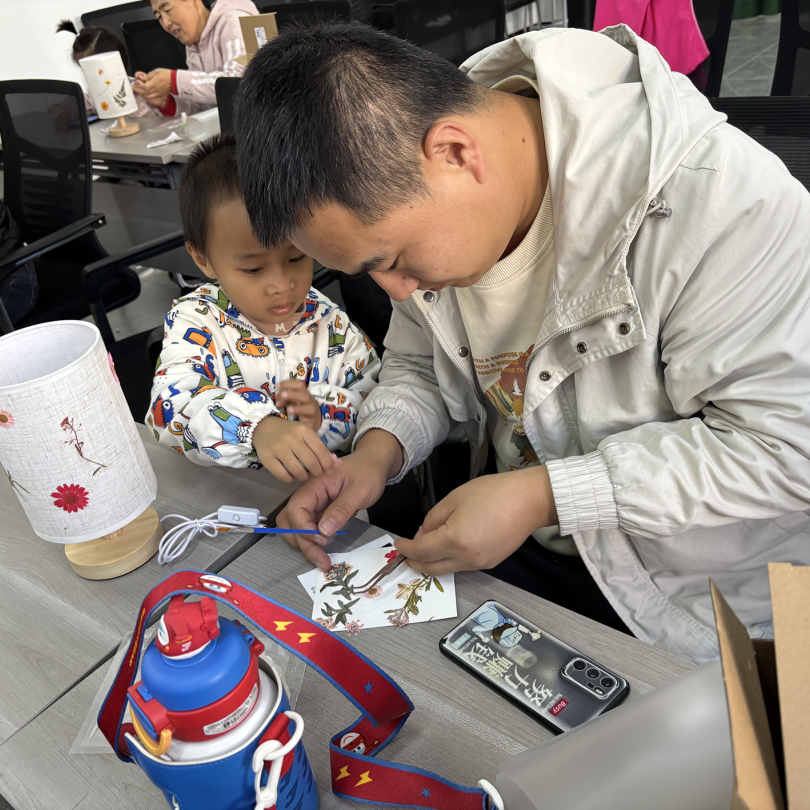 制作过程中,居民们互帮互助、交流心得,亲子家庭协作完成作品,现场氛围温馨融洽。活动尾声,居民们点亮自制台灯,成就感满满。