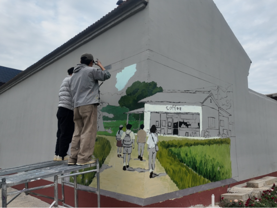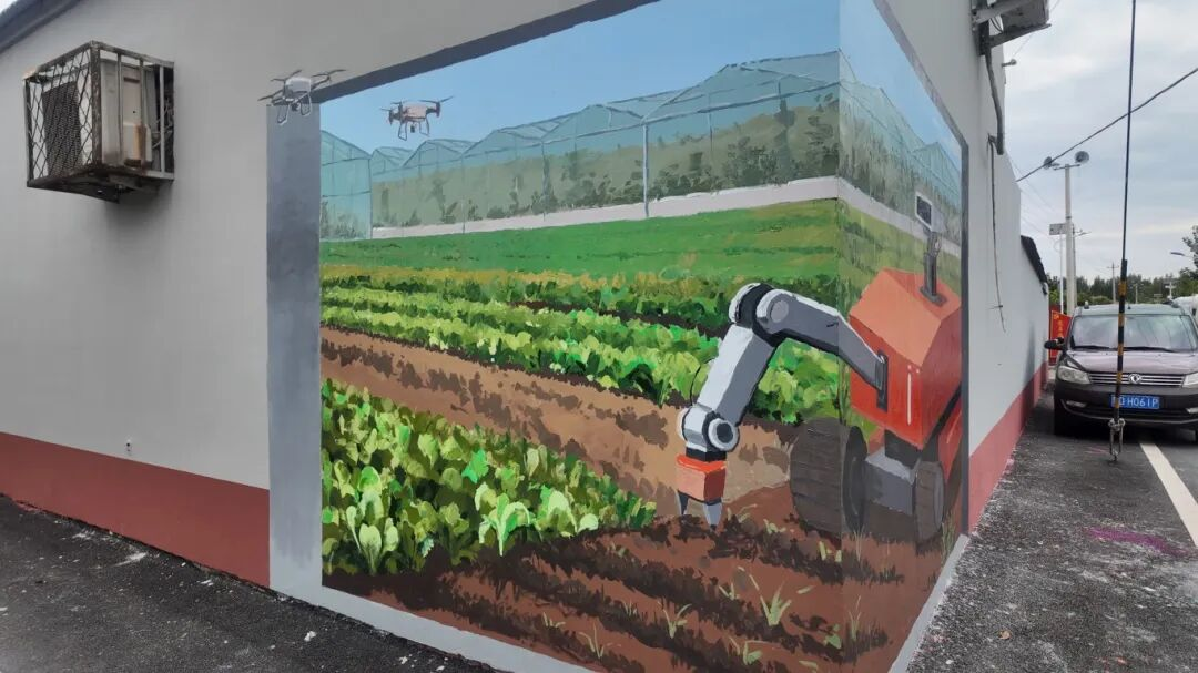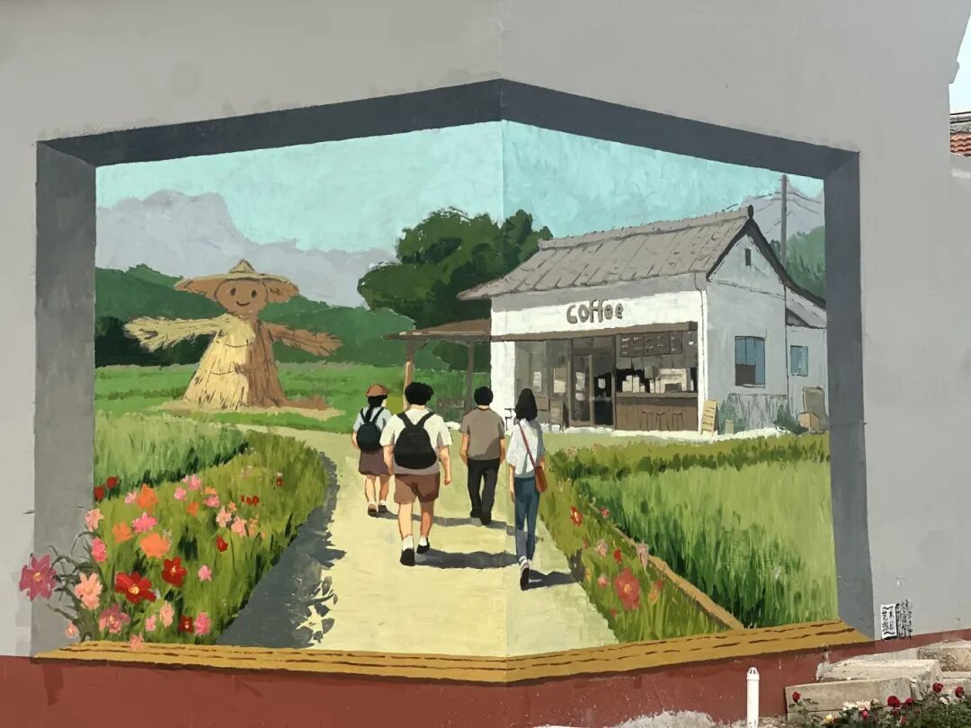 在村委会对门墙体转角处,“农业高科技” 主题视错觉墙绘借助立体透视原理,将智能温室、无人机植保等现代农业元素 “搬” 上墙面,从特定角度观看,仿佛实景跃然墙上;花坛对面墙体以 “农文旅新业态” 为核心,通过细腻线描勾勒出村民丰收采摘、游客体验农耕的热闹场景;周几咖啡旁的 “美丽乡村新风貌” 墙绘,则生动呈现了村民新居、整洁街巷、绿植环绕的宜居画面。