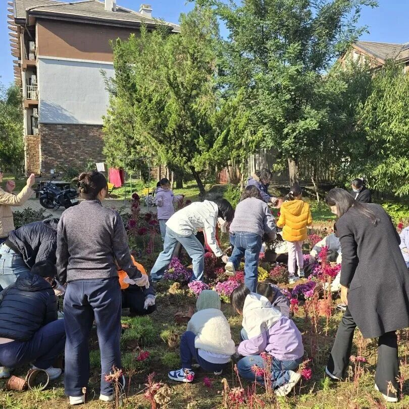 活动当天,社区工作人员提前准备好花苗、铁锹、手套等工具,并向亲子家庭讲解种植步骤和注意事项。“先把坑挖深一点,放花苗时要扶稳,填土后记得踩实……”在工作人员的示范指导下,家长与孩子迅速分工协作。有的挥锹铲土,有的扶苗定根,现场一派热火朝天的劳动景象。过程中,孩子们化身“小小护绿员”,家长们则耐心引导孩子操作,手把手教孩子掌握种植技巧,欢声笑语中,一棵棵充满生机的花苗被成功栽种,一个小小的花园在社区6号院的空地上完美呈现。