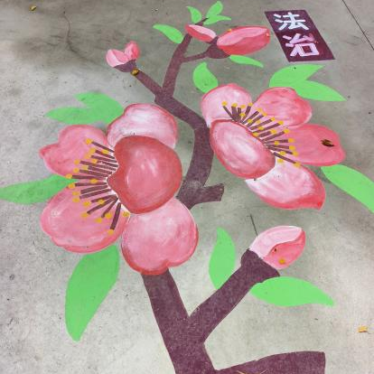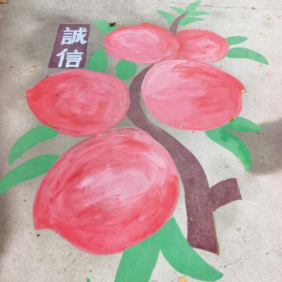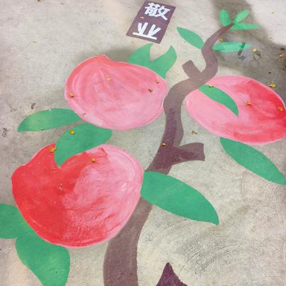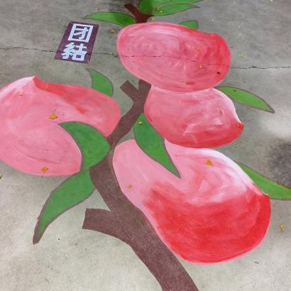 走进寅洞村村民中心,地面上的8幅彩绘同样引人驻足。村“两委”邀请本村乡村艺术家为其作画,以刘家店镇特色“桃花”“大桃”为创作灵感,粉色花瓣、饱满桃果的图案错落排布,鲜活又接地气;更巧妙的是,每幅地绘都搭配着一个核心价值观关键词——“诚信”“法治”“团结”“友爱”“和谐”“敬业”“爱国”“民主”,让本地特色与文明理念自然融合。脚下是熟悉的桃花与桃元素,眼里是醒目的文明字样,不知不觉中就把“爱国敬业”“诚信友善”的理念记在心里。没有生硬的说教,而是把文明融入日常步履间,让大家在不经意的目光接触中,就能感受到文明的熏陶。