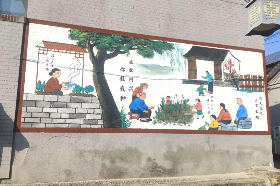 在前吉山村中街,一幅充满乡土气息的墙体彩绘正静静“讲述”着乡村故事。灰白色的砖房墙面好似天然画布,画面中,村民们或劳作、或休憩,孩童在旁嬉戏,搭配古朴的房屋、葱郁的树木,俨然一幅“看得见乡愁”的乡村生活图景。同时,“家业同兴你教我种”“情无远近力有长短”等文字点缀其间,传递出乡村邻里互助、和睦共处的淳朴民风。