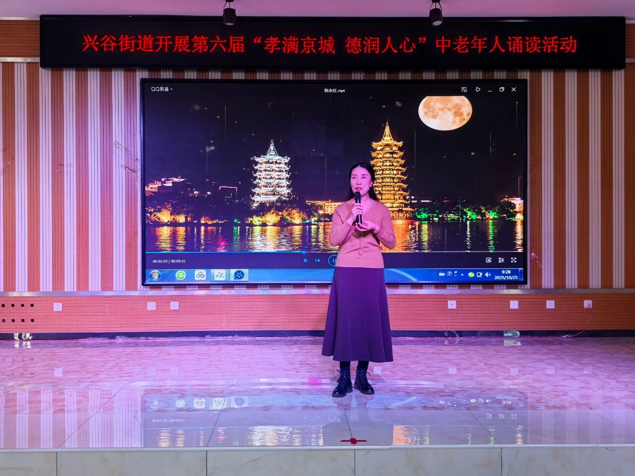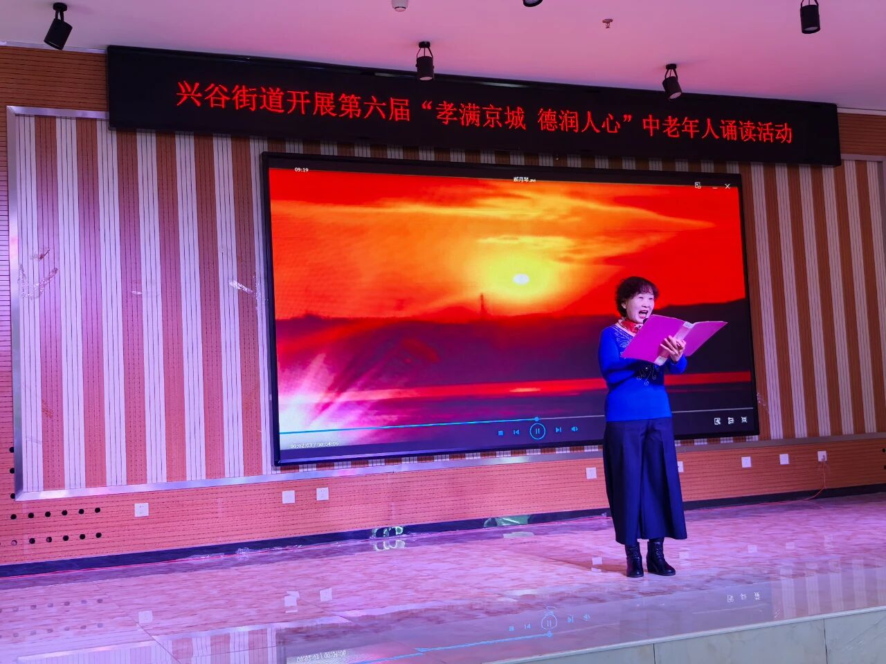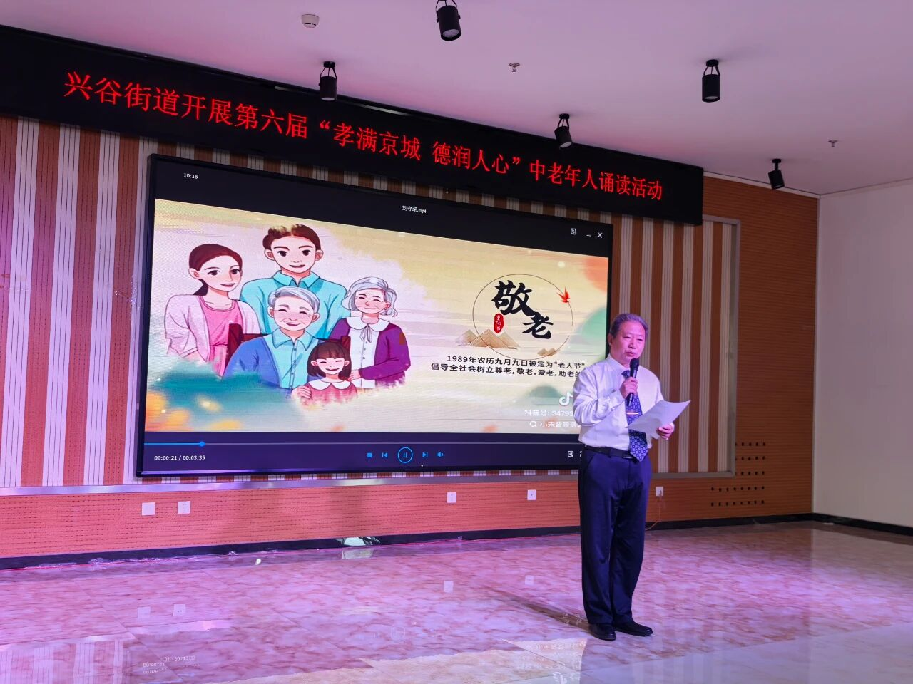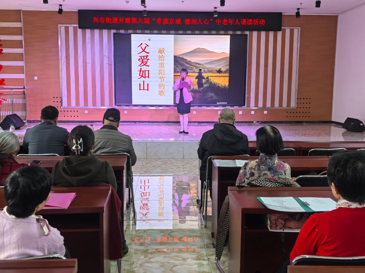 活动在温馨祥和的气氛中拉开帷幕。现场,20位来自辖区各社区的朗诵者精神矍铄,身着素雅服装,依次登台。他们以饱满的深情,诵读了《孝心敬老 从我做起》、《趁父母还在》等一系列经典篇目与感人至深的原创作品。一声声铿锵有力或温柔深情的诵读,或追忆父母恩情,或阐述孝道内涵,或倡导身体力行,字里行间流淌着尊老敬老的深厚情感,使在场听众沉浸其中,深受感动,在聆听与感悟中接受了一次中华优秀传统文化的洗礼与滋养。