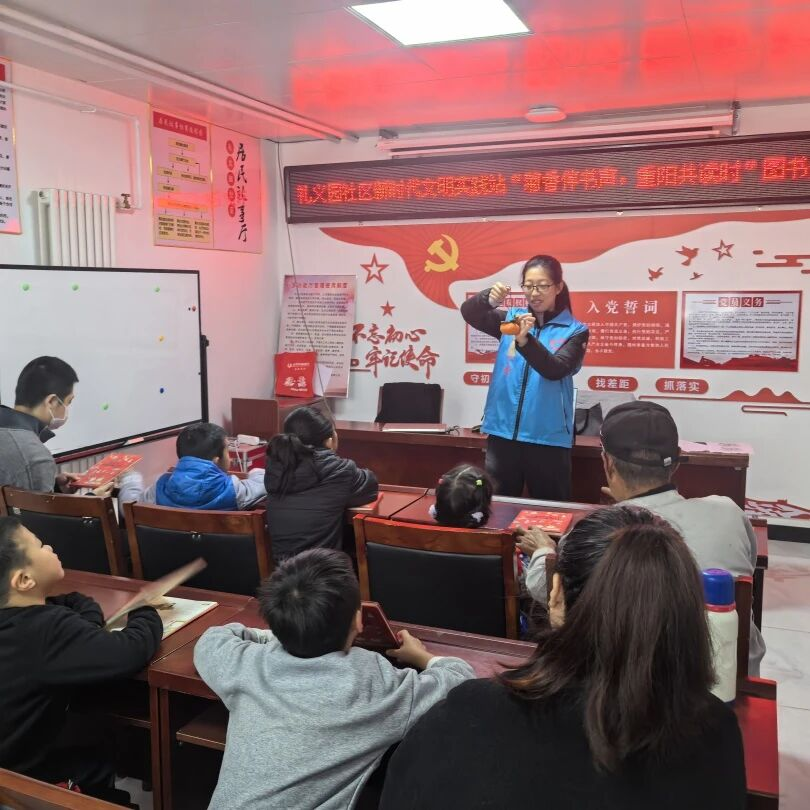 活动以《中国传统节日》“重阳节”章节为核心。分享环节,志愿者带领居民品读重阳起源、登高赏菊等习俗及“长寿安康”寓意,居民踊跃交流:“读完才懂重阳‘辞青’的讲究,以前只知吃糕,书中诗词让我想起陪父母登高的时光。”