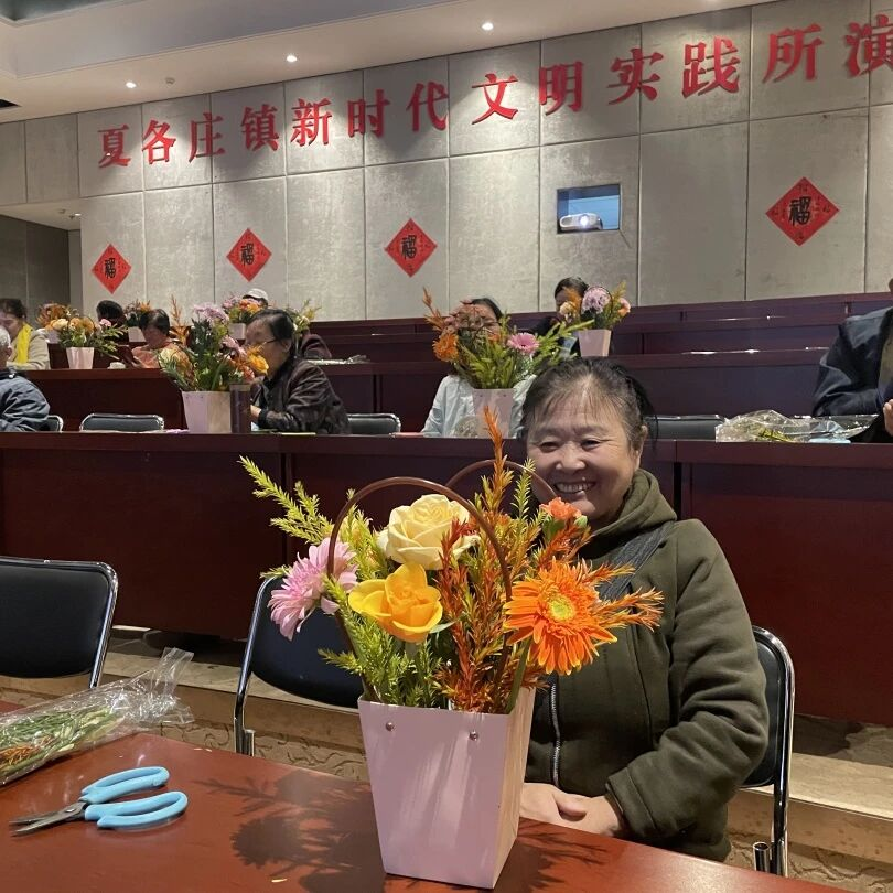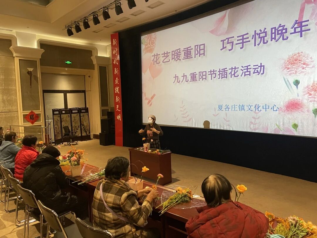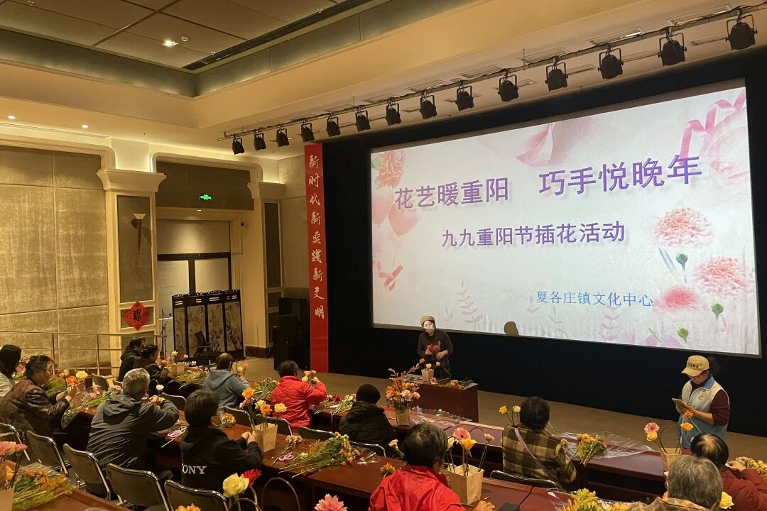 金秋送爽,今又重阳。为丰富老年人的精神文化生活,弘扬尊老敬老的社会美德,夏各庄镇文化服务中心举办了“花艺暖重阳 巧手悦晚年”主题插花活动。25位65周岁以上的老年朋友参与其中,亲手创作花艺作品,在传统节日里感受温馨与雅致。