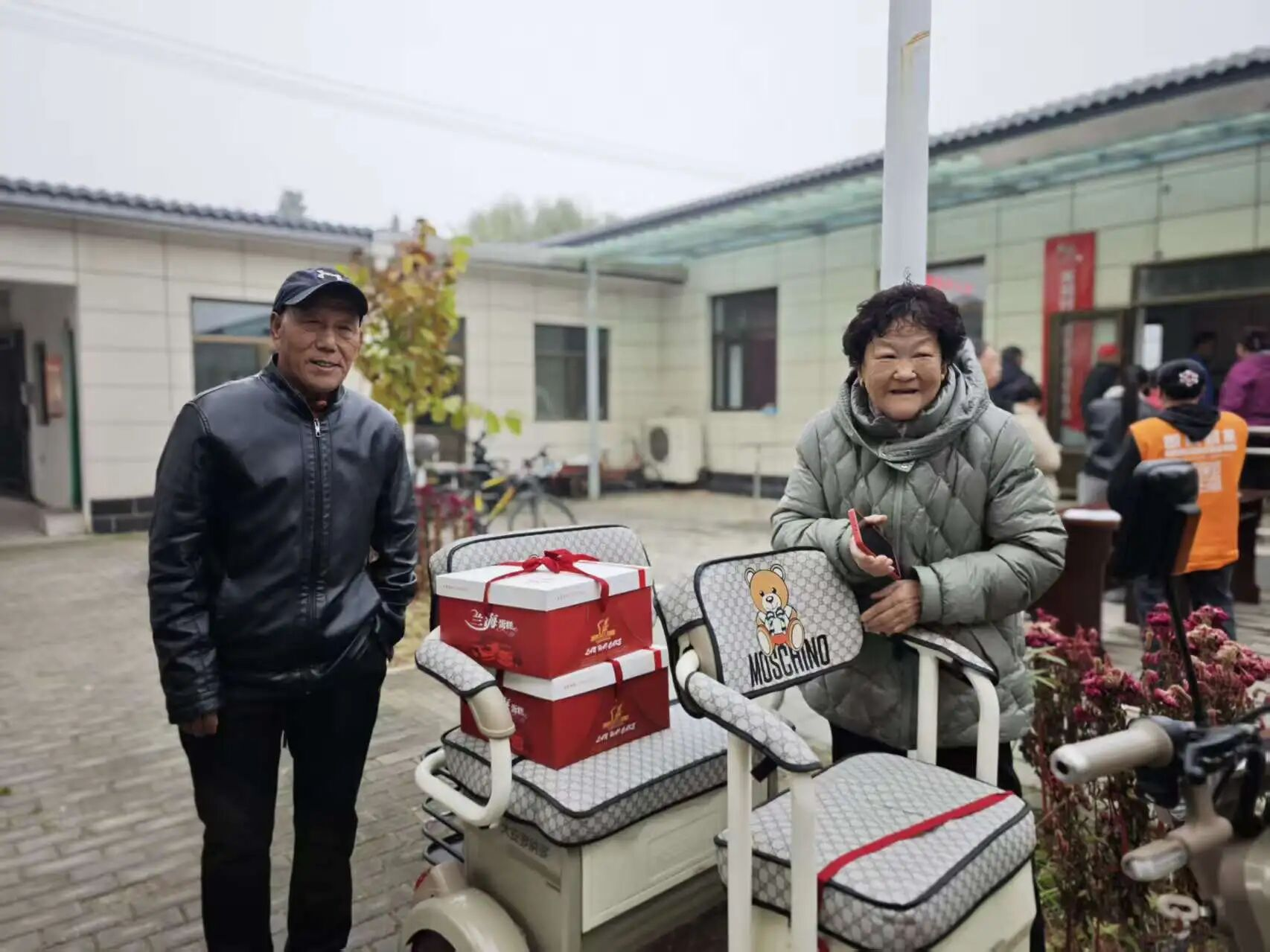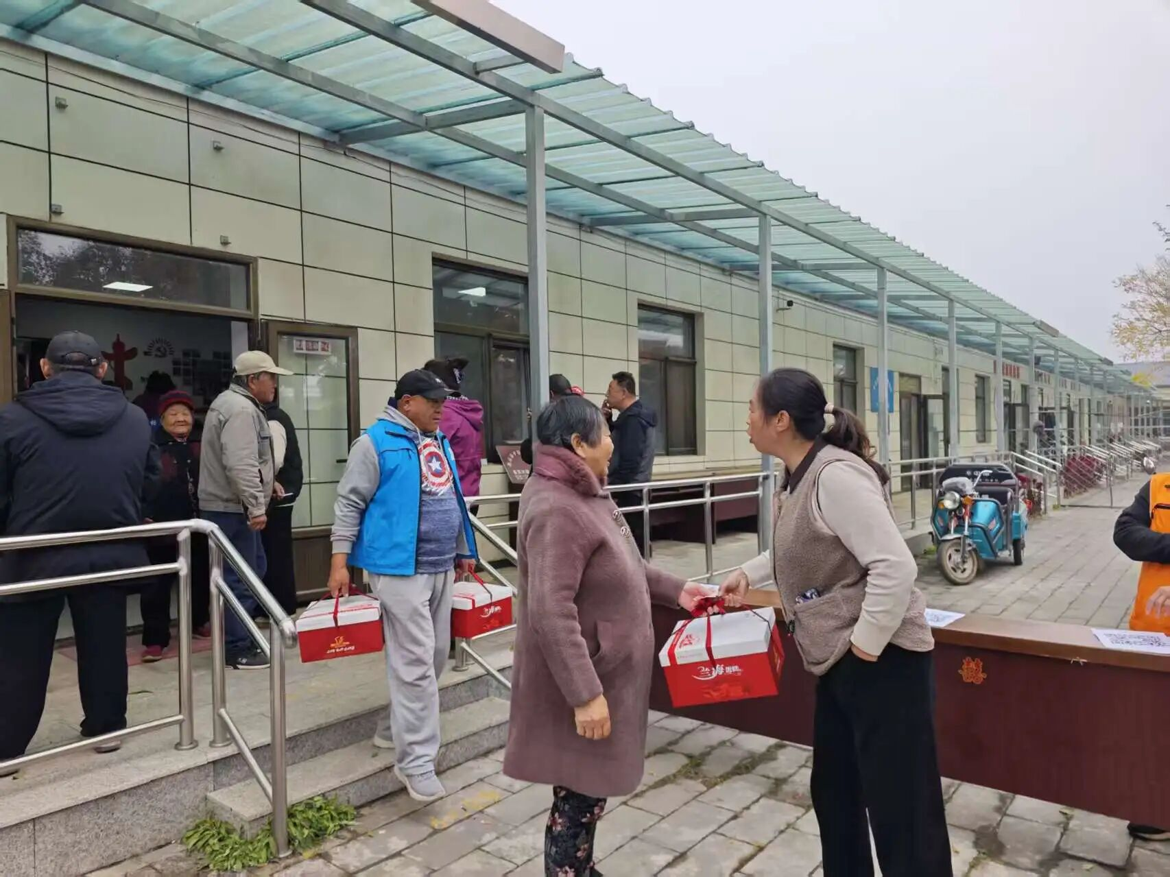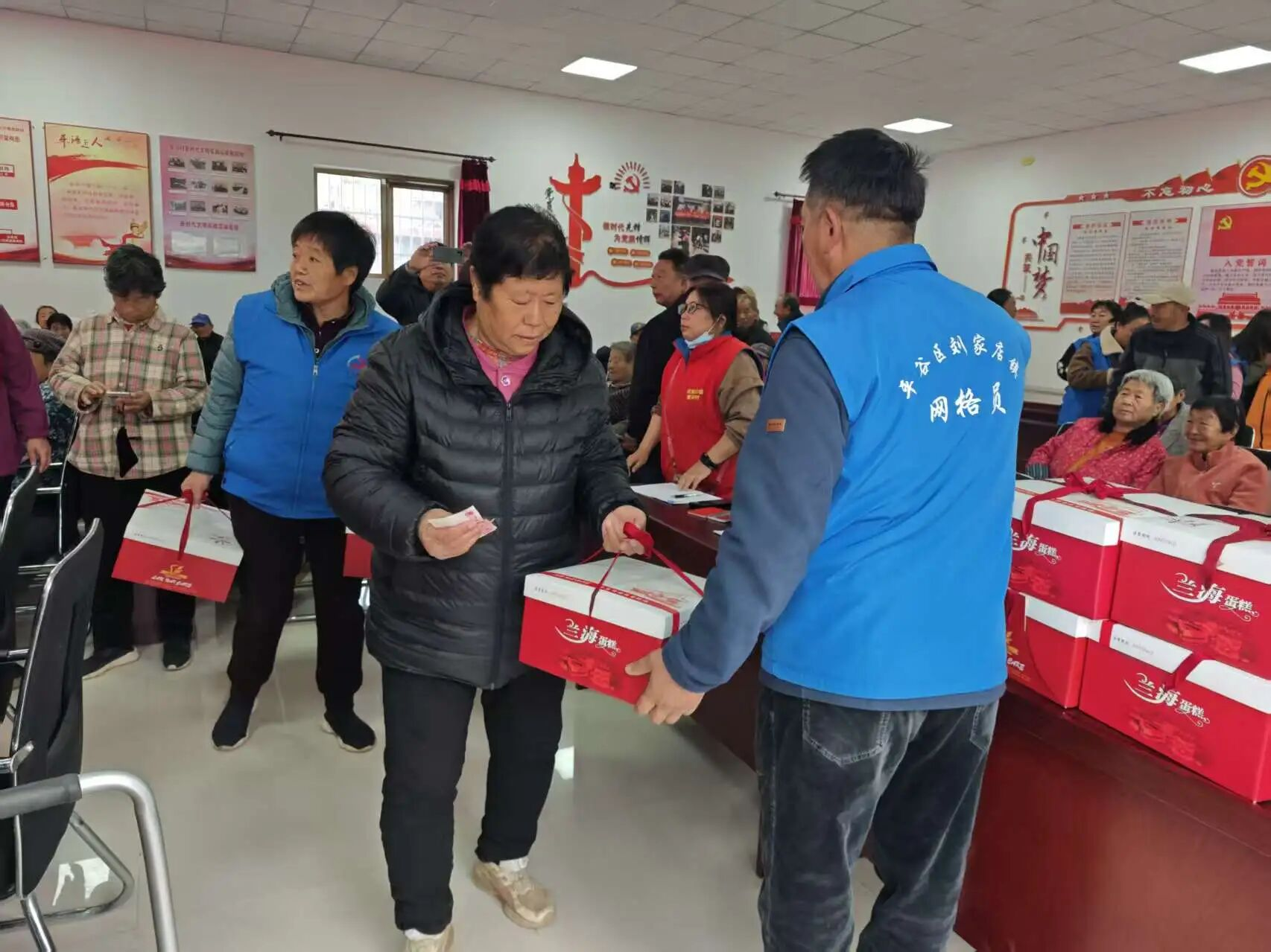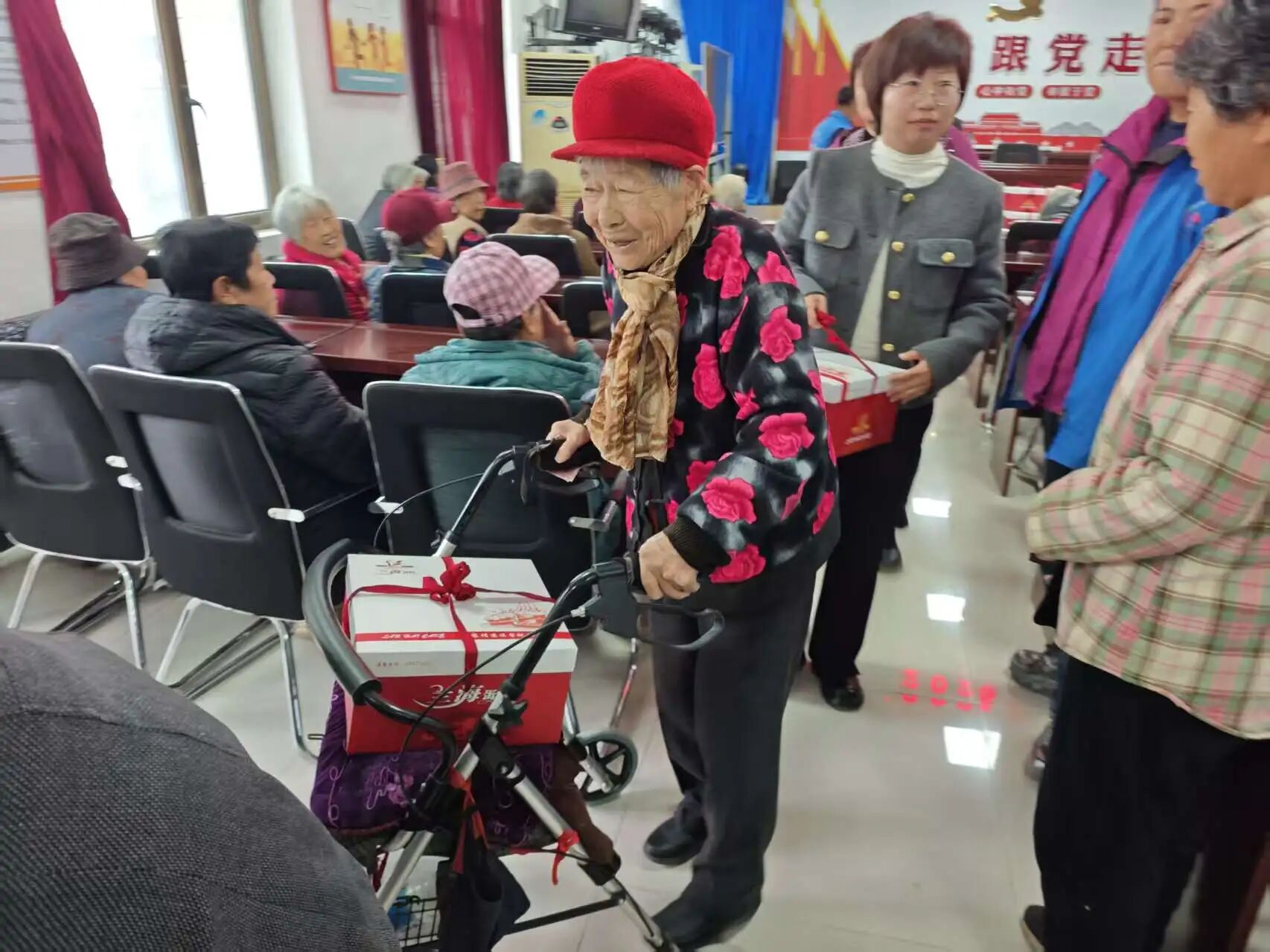 随着活动开始,村“两委”成员与网格员们忙碌的身影穿梭在人群中:他们小心翼翼地将包装精美的点心礼盒递到老人手中,双手把慰问金信封送到长辈面前,轻声叮嘱“您拿好,注意身体”;网格员们更是把服务做到了细节里——看到行动不便的老人,主动上前搀扶着找座位;老人接过点心礼盒拎着吃力,立刻伸手帮忙提稳;活动结束后,还细心地把点心放到老人的代步车上,陪着行动不便的长辈慢慢走下楼梯,全程贴心护送。这些不起眼的小事,却让现场暖意更浓。拿到礼物的老人们笑得合不拢嘴,有的互相展示手中的点心,有的不停地向工作人员道谢,现场欢声笑语不断,成为秋日里最动人的画面。