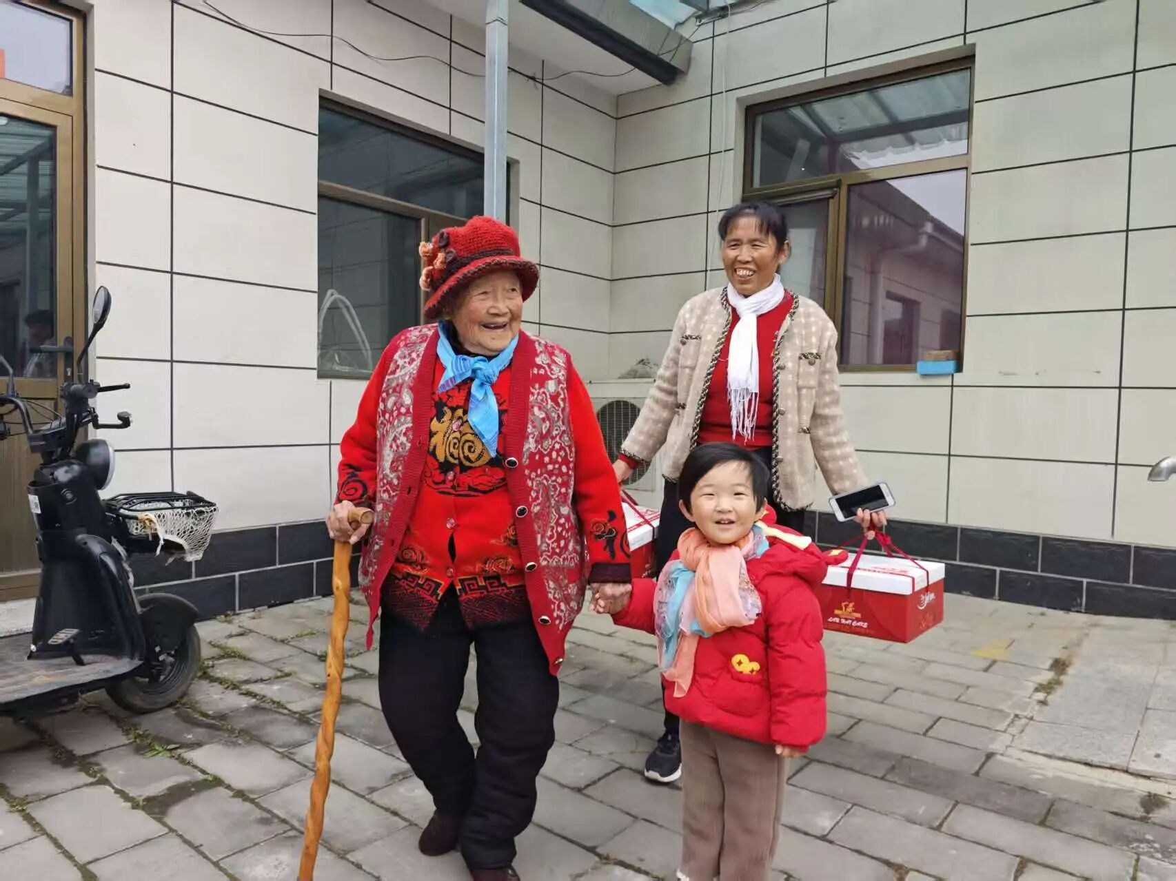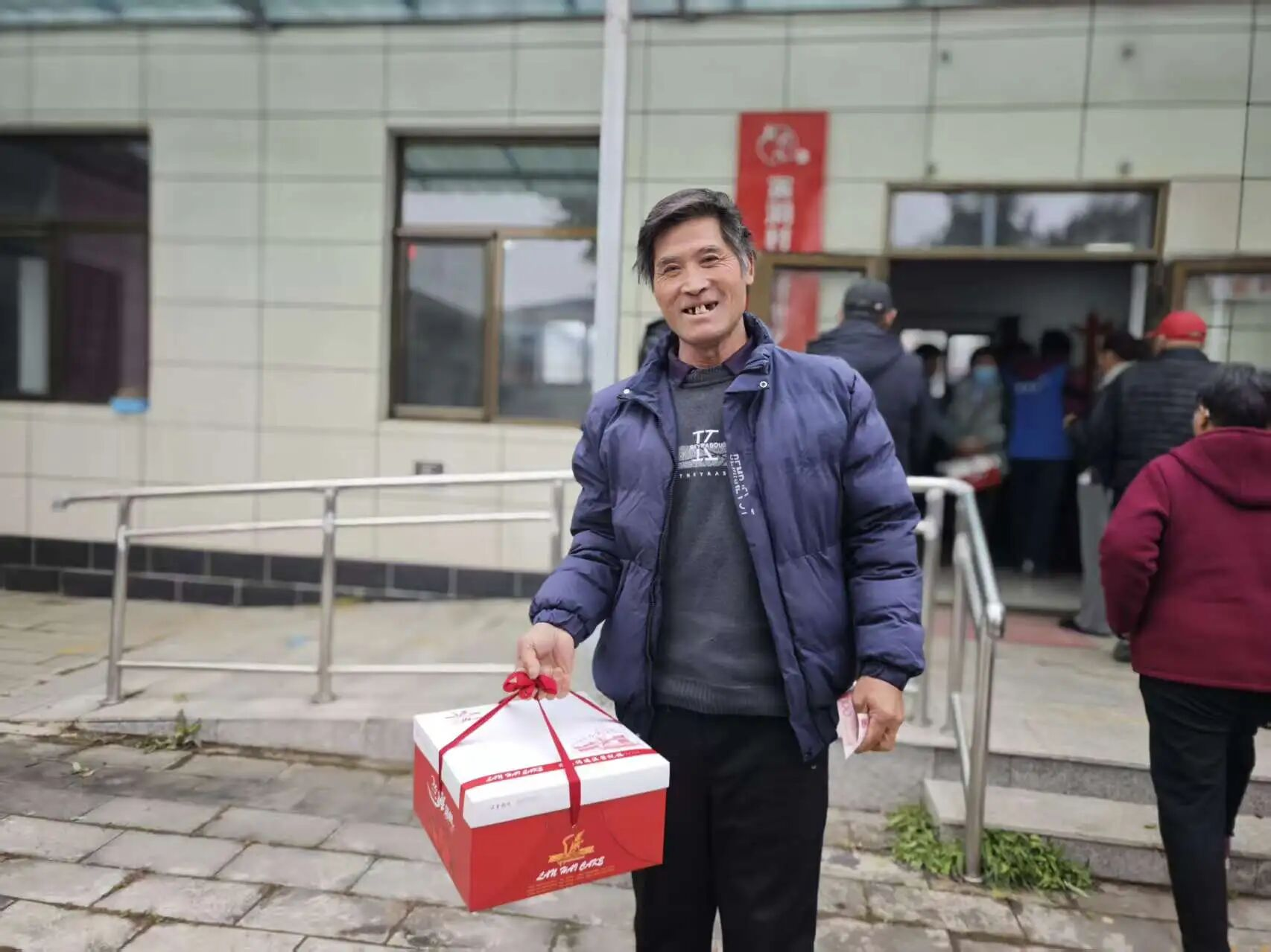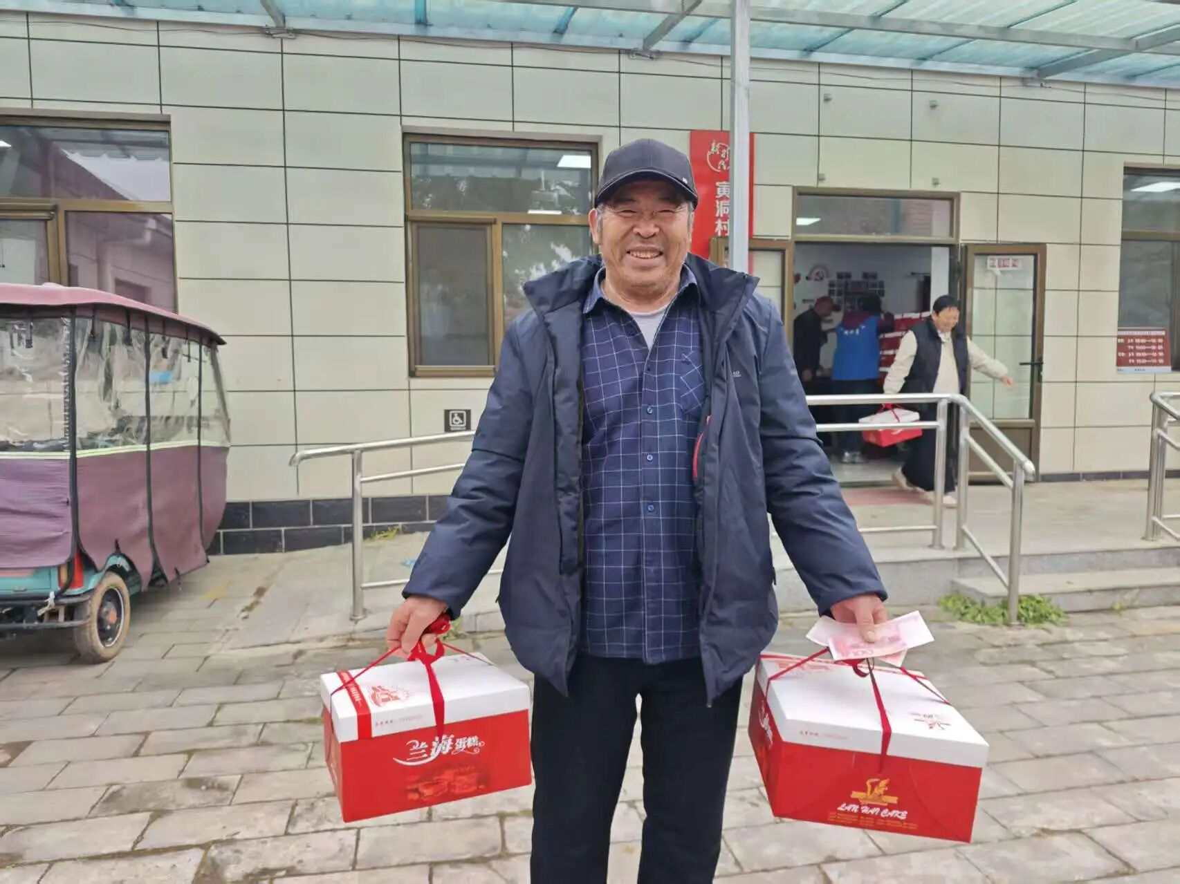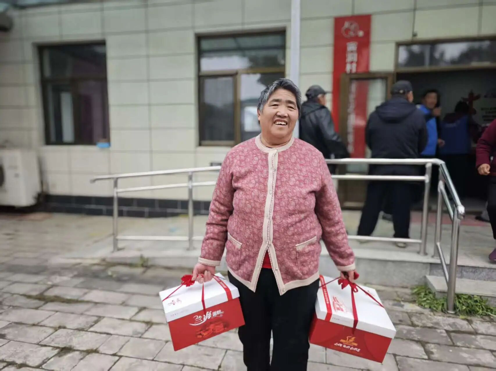 随着活动开始,村“两委”成员与网格员们忙碌的身影穿梭在人群中:他们小心翼翼地将包装精美的点心礼盒递到老人手中,双手把慰问金信封送到长辈面前,轻声叮嘱“您拿好,注意身体”;网格员们更是把服务做到了细节里——看到行动不便的老人,主动上前搀扶着找座位;老人接过点心礼盒拎着吃力,立刻伸手帮忙提稳;活动结束后,还细心地把点心放到老人的代步车上,陪着行动不便的长辈慢慢走下楼梯,全程贴心护送。这些不起眼的小事,却让现场暖意更浓。拿到礼物的老人们笑得合不拢嘴,有的互相展示手中的点心,有的不停地向工作人员道谢,现场欢声笑语不断,成为秋日里最动人的画面。
