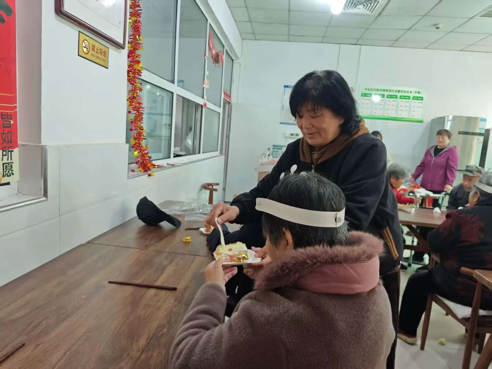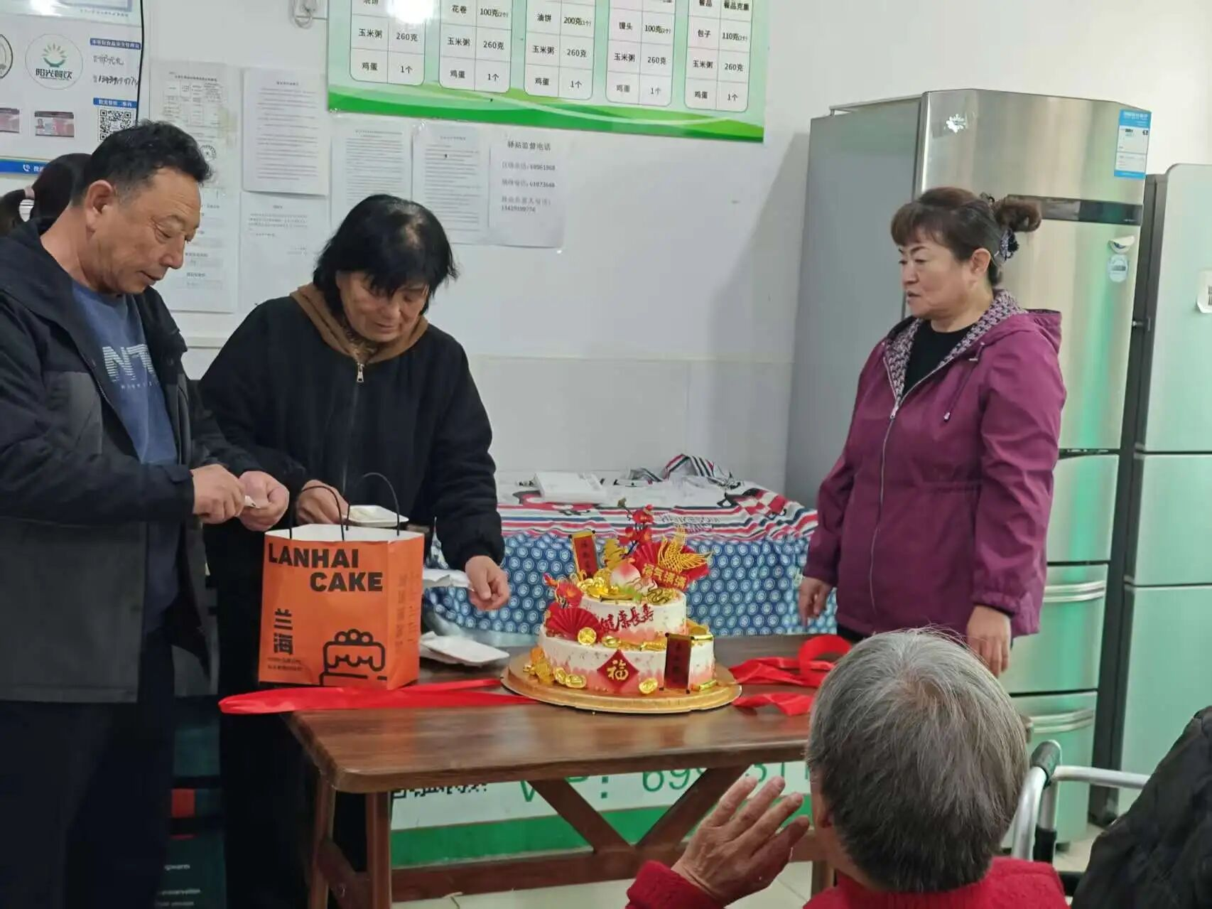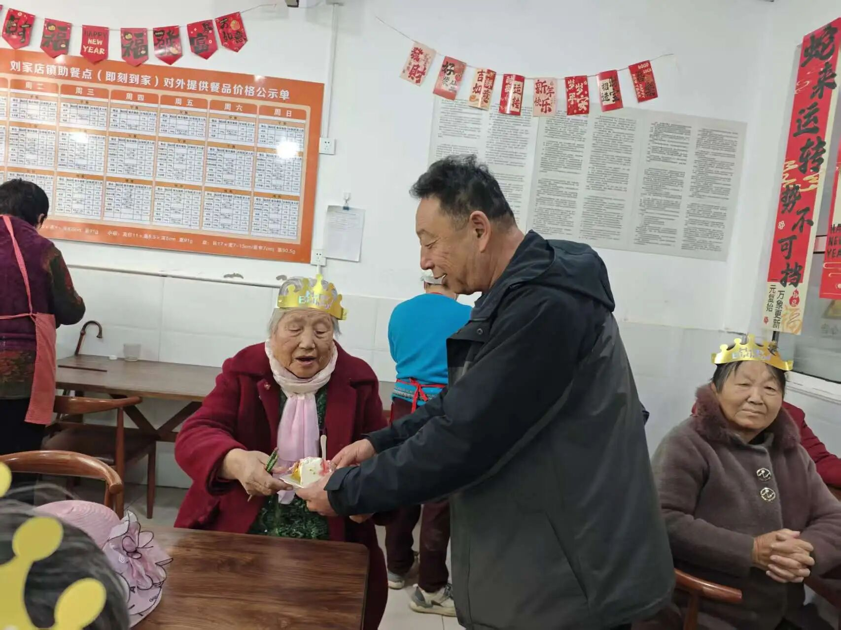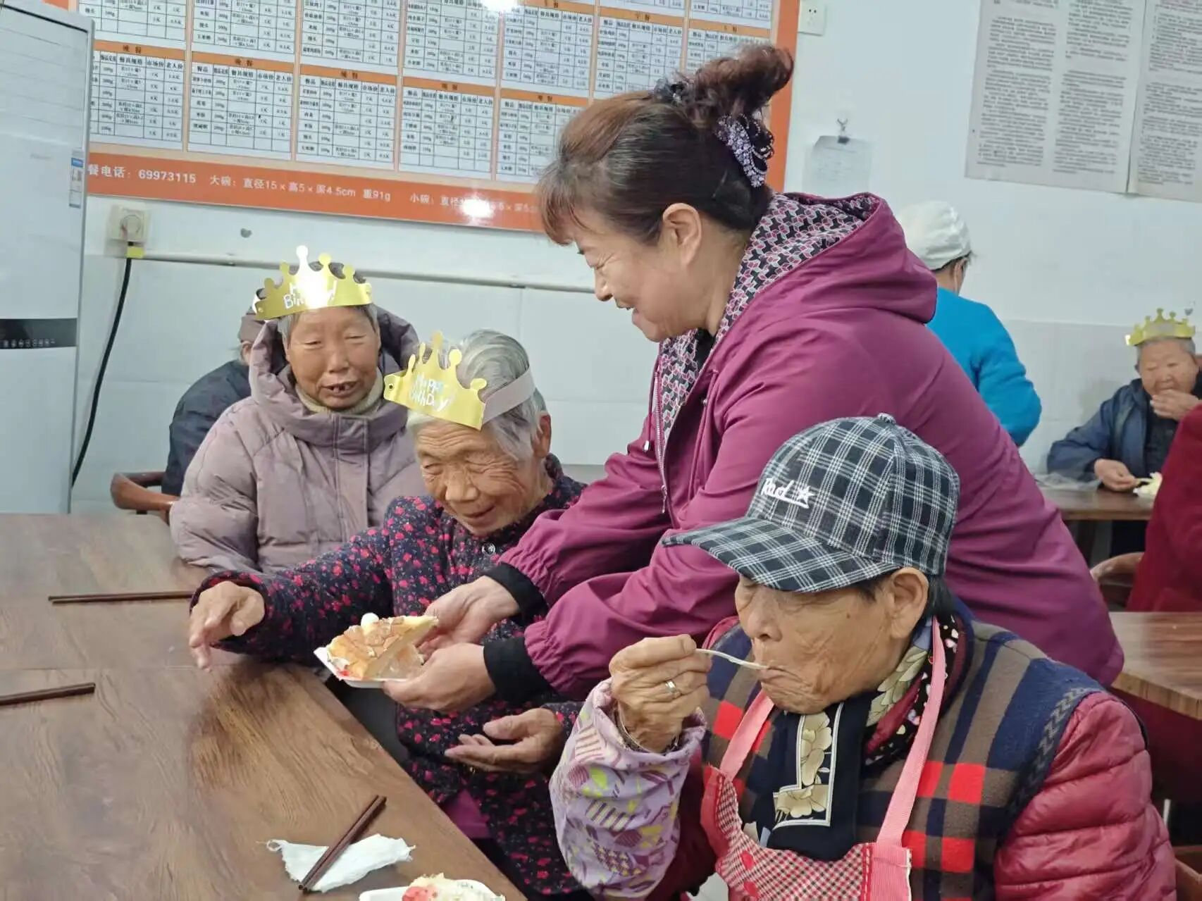 村干部们亲手为每位老人切分蛋糕,将满满的祝福送到老人手中。老人们小口品尝着蛋糕,脸上洋溢着幸福的笑容,有的老人还忍不住竖起大拇指:“这蛋糕真甜,村里想得太周到了!”简单的互动、温馨的场景,让养老驿站里充满了家的味道,也让老人们在节日里收获了满满的幸福感,整个场景充满了“老有所养、老有所乐”的温暖气息。