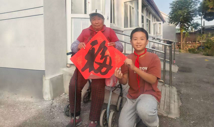 亲手绘制的贺卡、笔墨工整的“福寿安康”书法作品,每一笔、每一剪都藏着心意。老人们捧着这些礼物,反复摩挲着纸面,眼角的笑意藏都藏不住:“这字写得好,这画真好看!”