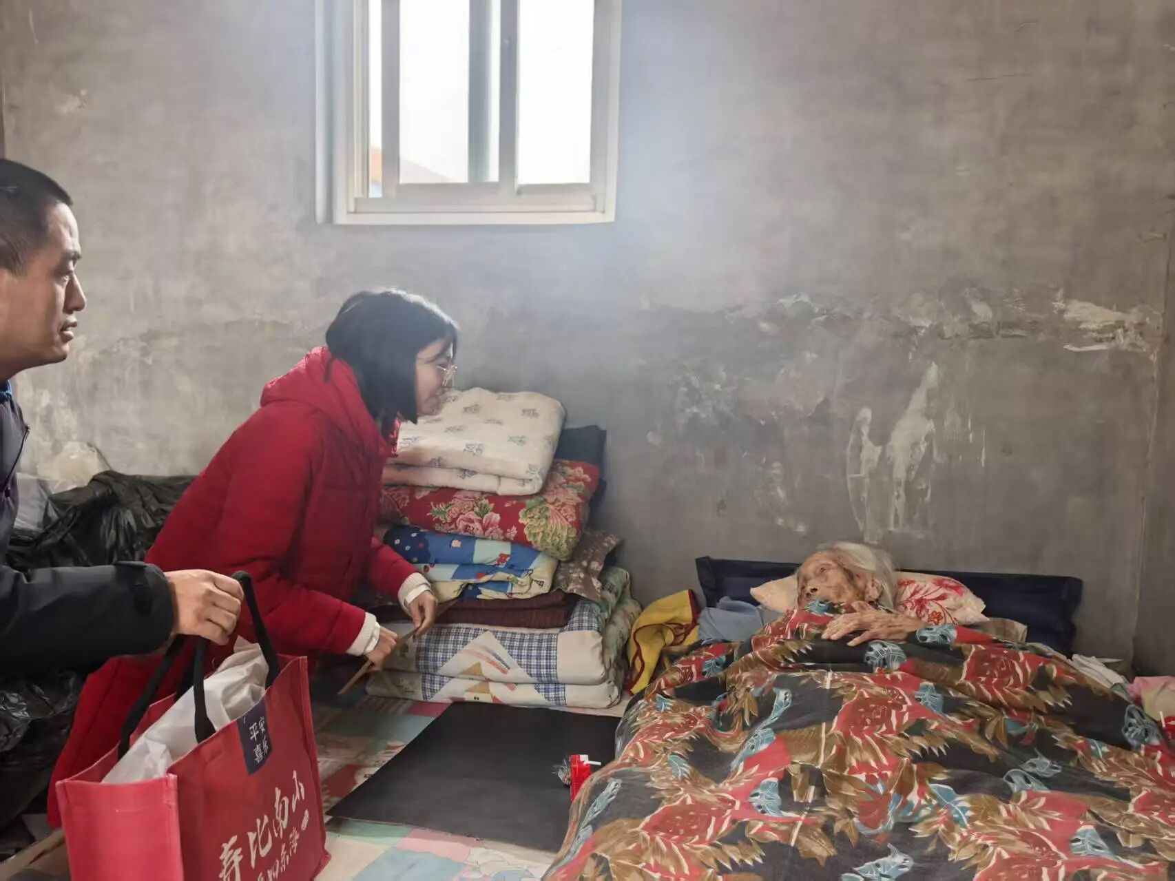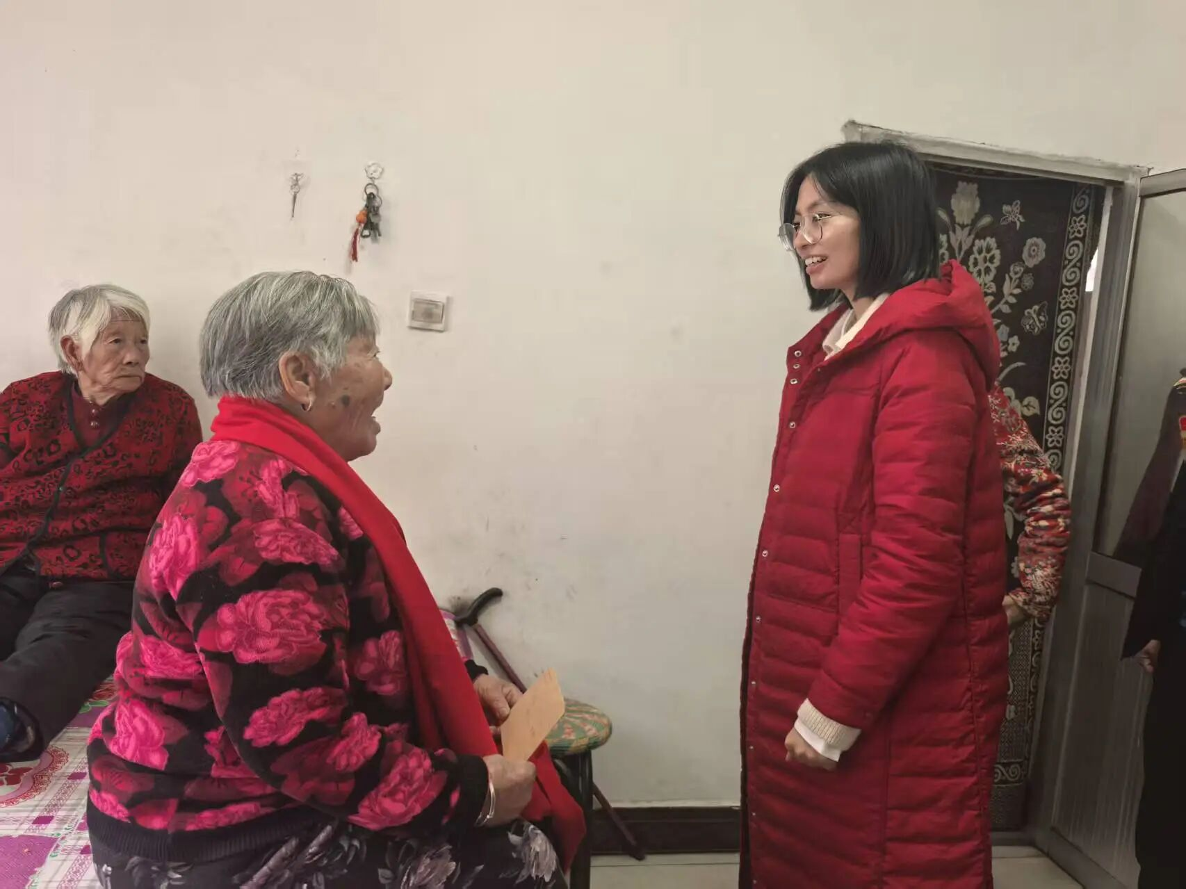随后,慰问组一行走访了辖区内的百岁老人。在老人家中,成乡长与老人及其家人亲切交谈,关切地询问老人的日常起居和健康状况,并送上了慰问金、红围巾及节日祝福。