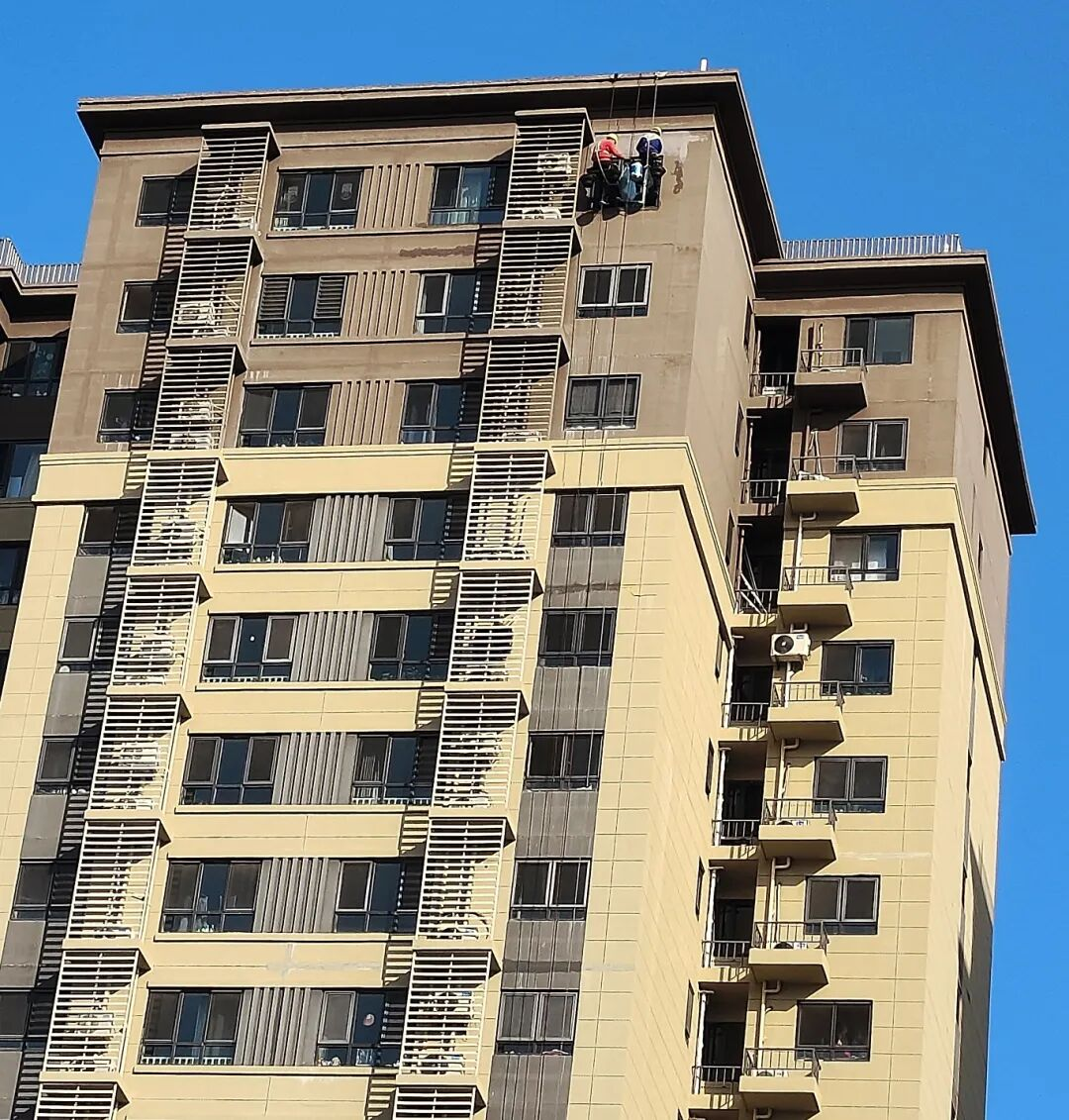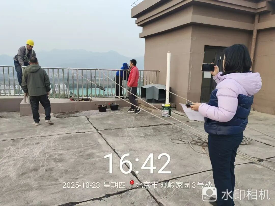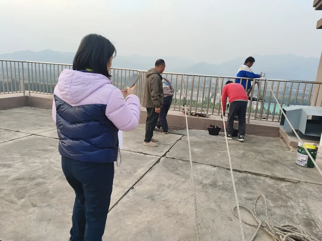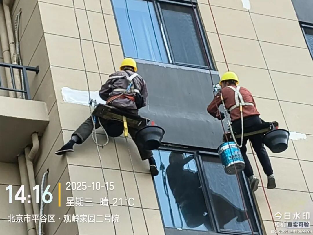 十月份以来,北京进入秋高气爽的施工黄金期,天气持续干燥,墙体内外湿气基本散发,具备高标准施工条件。社区紧抓这一关键时期,赶在供暖之前,聘请专业高空作业团队对外墙及部分屋顶檐口开展全面排查与防水处理。施工人员采取“蜘蛛人”作业方式,对已发现的漏点进行精细封堵,并对潜在裂缝实施预防性加固,在冬季来临前彻底解决渗漏隐患。