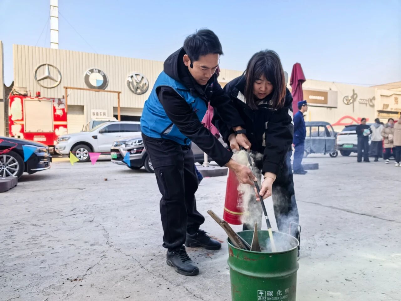 演练正式开始前,消防人员结合文发市场商户密集、货物堆放集中的特点,开展了细致的消防器材实操教学。针对灭火器,消防人员详细讲解了“提、拔、握、压”的核心使用步骤,强调在使用时需对准火焰根部喷射,并现场示范操作要领,随后让商户们逐一上手练习,及时纠正不规范动作;对于消防栓的连接与使用,重点演示了水带铺设、接口连接及开关阀门的技巧,提醒商户注意水压控制和操作安全;同时,还指导商户正确佩戴防烟面罩,讲解其过滤有毒气体的原理和使用时机,演示灭火毯覆盖火源的正确方法,确保大家都能熟练掌握基础消防器材的操作技能。