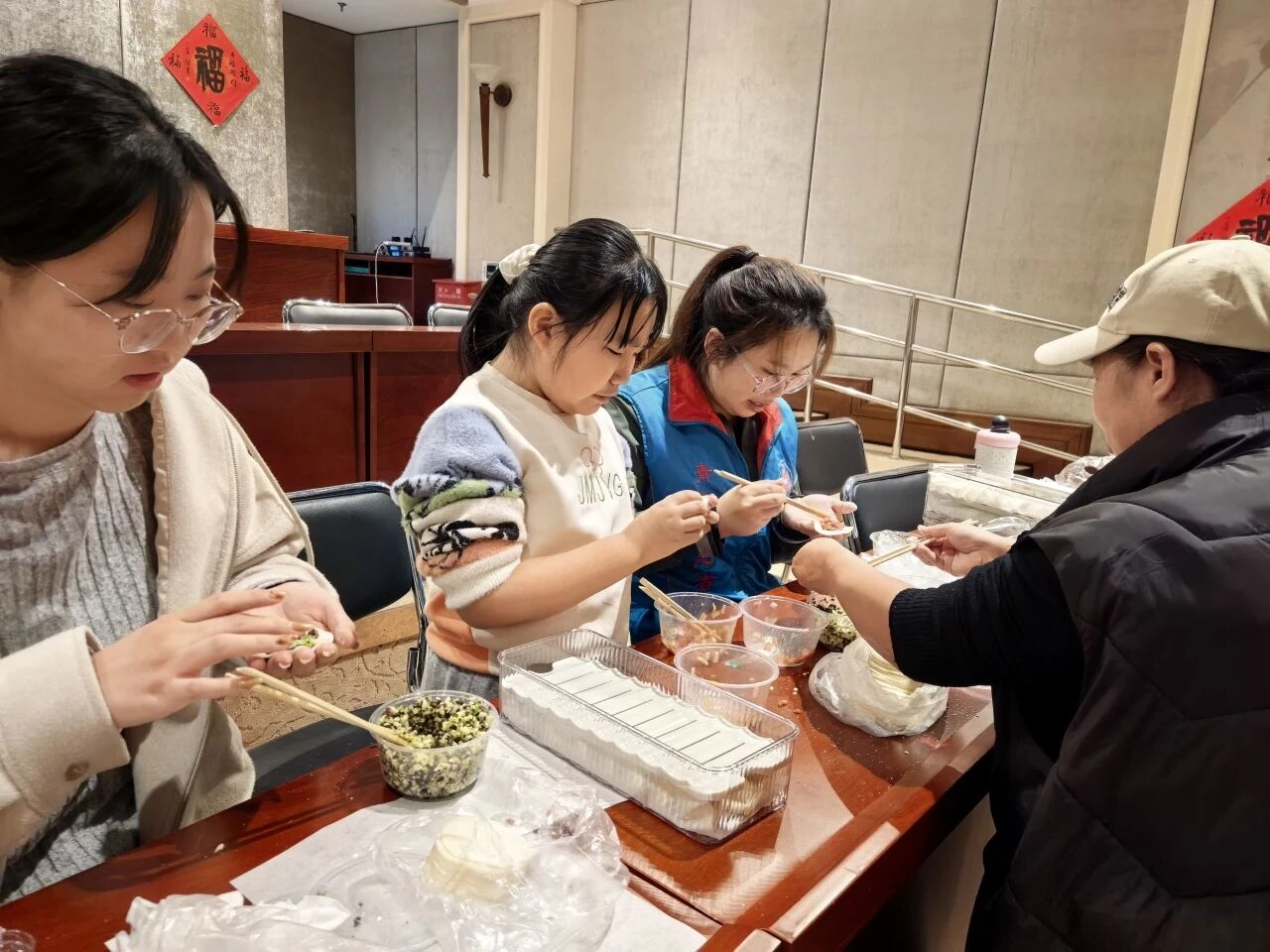 包饺子环节将现场气氛推向高潮。志愿者们早早备好饺子皮、馅料与工具,演示调馅、包捏的技巧。大家兴致勃勃,洗净双手后围坐桌旁,纷纷化身“厨房能手”。
