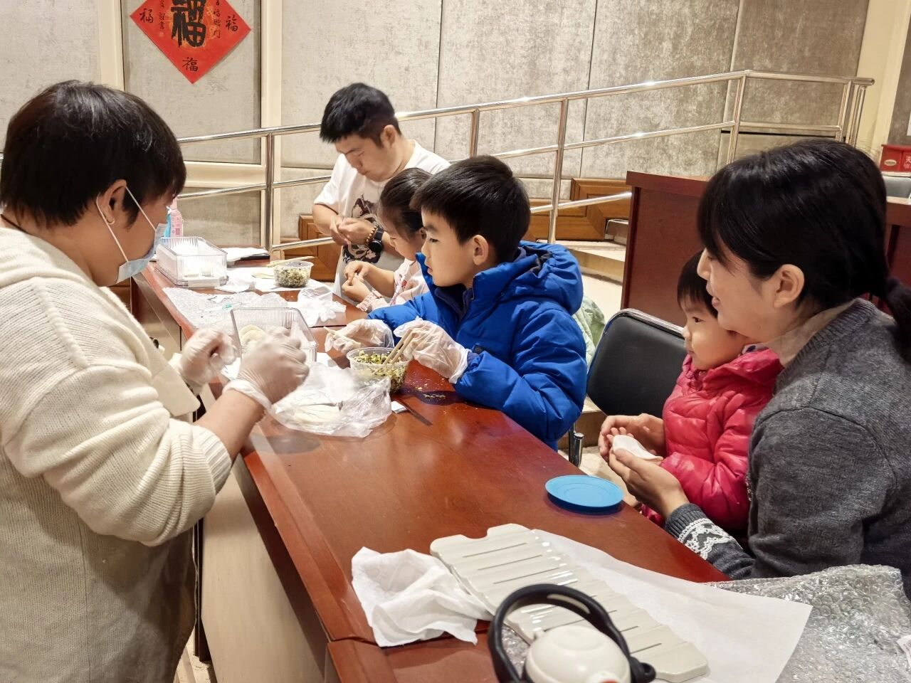 孩子们在家长和志愿者的引导下放馅、捏合面皮,包出的饺子形态各异。有的如“元宝”,有的似“月牙”,更有创意十足的“小笼包”造型,孩子们脸上写满了专注与自豪。大人们则一边娴熟地包着饺子,一边闲话家常。转眼间,一排排白白胖胖的饺子便摆满餐盘。