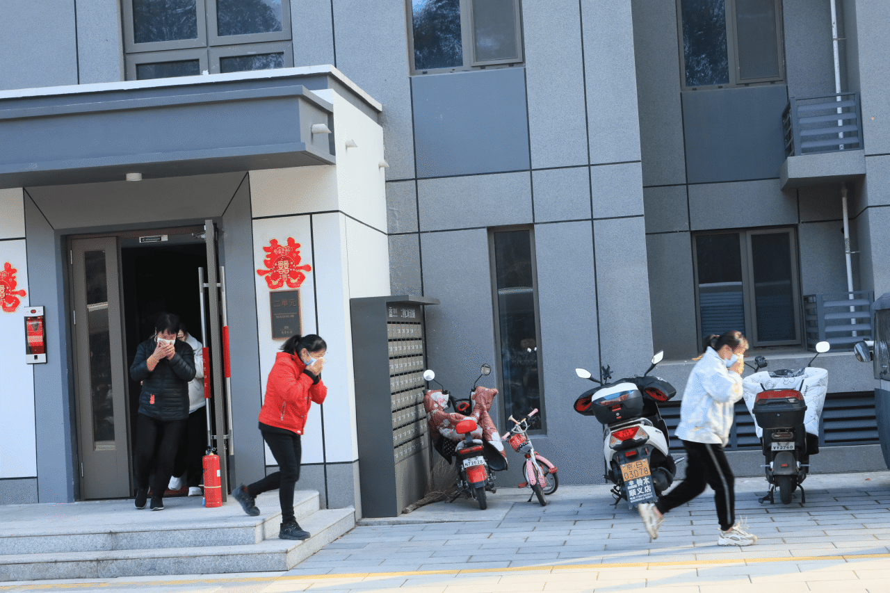 演练模拟社区一楼层突发电器火灾。随着报警器警报声响起,中控值守人员立即通过监控确认报警位置,并携带对讲机在3分钟内赶赴现场查看火情。