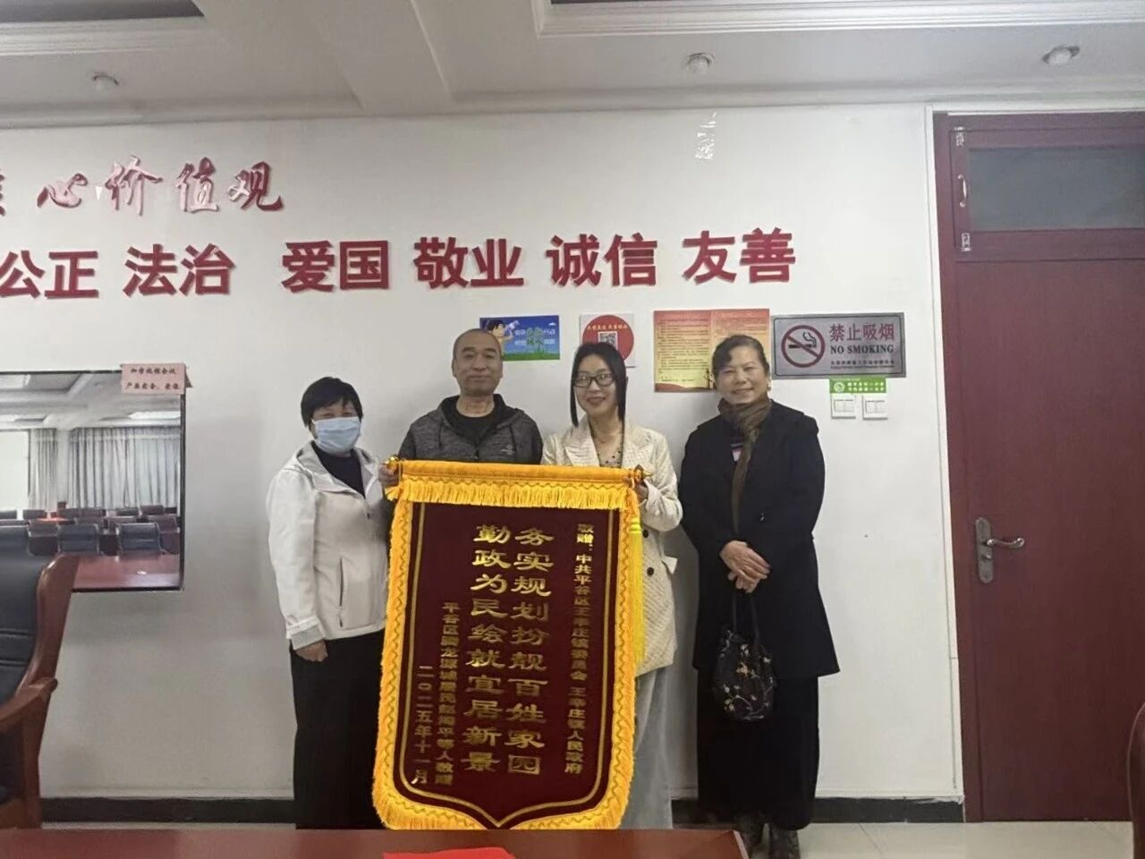 11 月 14 日上午,王辛庄镇机关办公室迎来了特殊的 “客人”—— 家住腾龙源城小区居民赵先生等人专程送来印有 “务实规划扮靓百姓家园,勤政为民绘就宜居新景”的锦旗,紧紧握住王辛庄镇副镇长郭青的手,说道:“全景宠它乐园建成后,我家‘毛孩子’有了撒欢地,我们也多了休闲好去处,政府真是把实事办到了我们心坎里!”