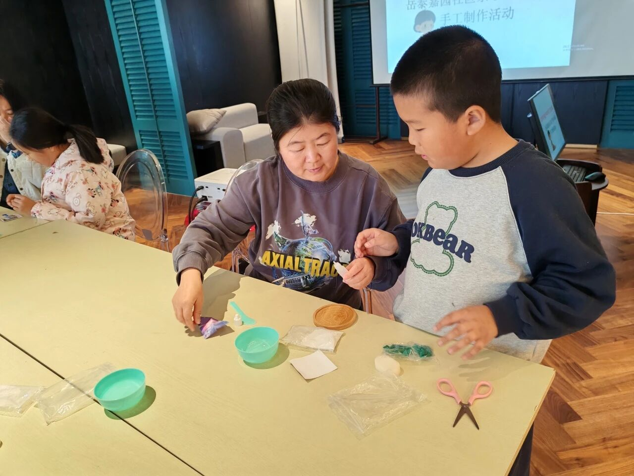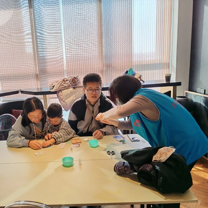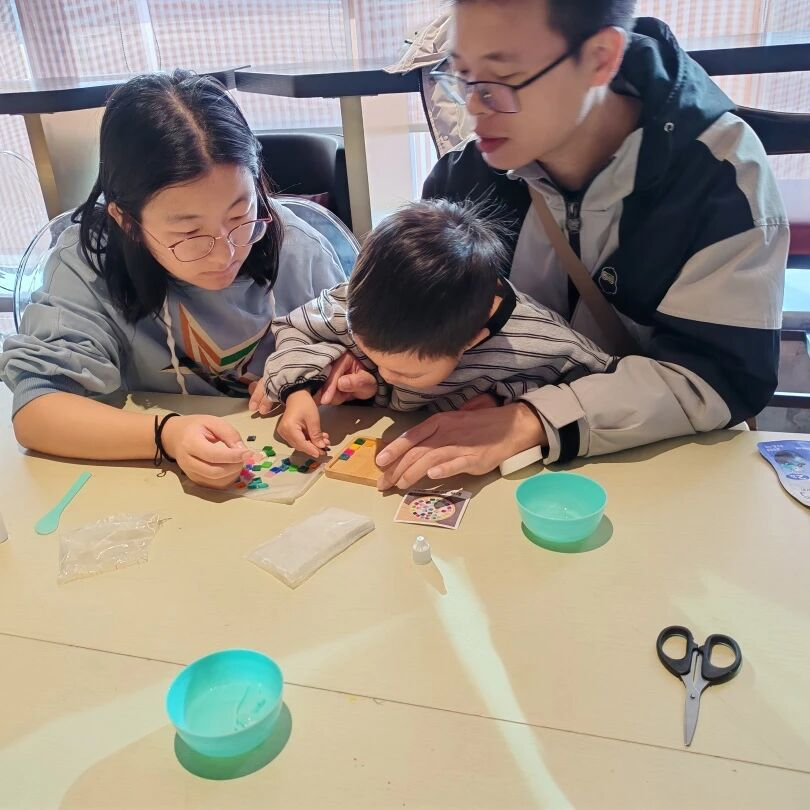 接着,在志愿者的带领下,父母和孩子完成杯垫的制作。大家仔细挑选着每一片马赛克,用心地在木质托盘上拼接出各式各样的图案和形状,从简单的几何图形到复杂的花卉、动物图案,无不展现出孩子们丰富的想象力和独特的创造力。在制作过程中,父母和孩子互相交流,分享制作过程。孩子们时而低头认真拼接,时而抬头与父母交流,享受着创作带来的快乐。经过一个多小时的努力,一个个色彩斑斓、形态各异的马赛克杯垫在孩子们的手中诞生。