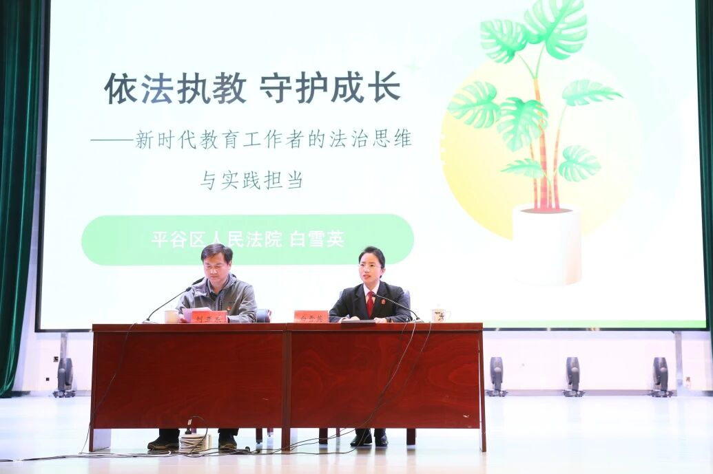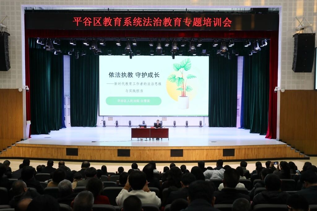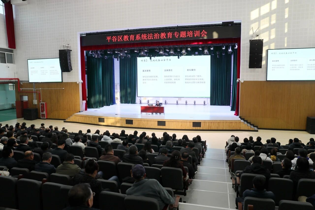 近日,平谷法院党组成员、副院长白雪英走进平谷区教育系统讲授《依法执教 守护成长——新时代教育工作者的法治思维与实践担当》专题法治课,区委教育两委领导及机关各科长(负责人)和教育系统所属事业单位中层及以上干部700余人参会。此次活动是平谷法院与区教育两委设立“法护万家”普法驿站后的重要实践,也是落实《中华人民共和国法治宣传教育法》的具体举措,旨在帮助教育工作者提高法治素养,依法履职、防范风险,守护未成年人健康成长。