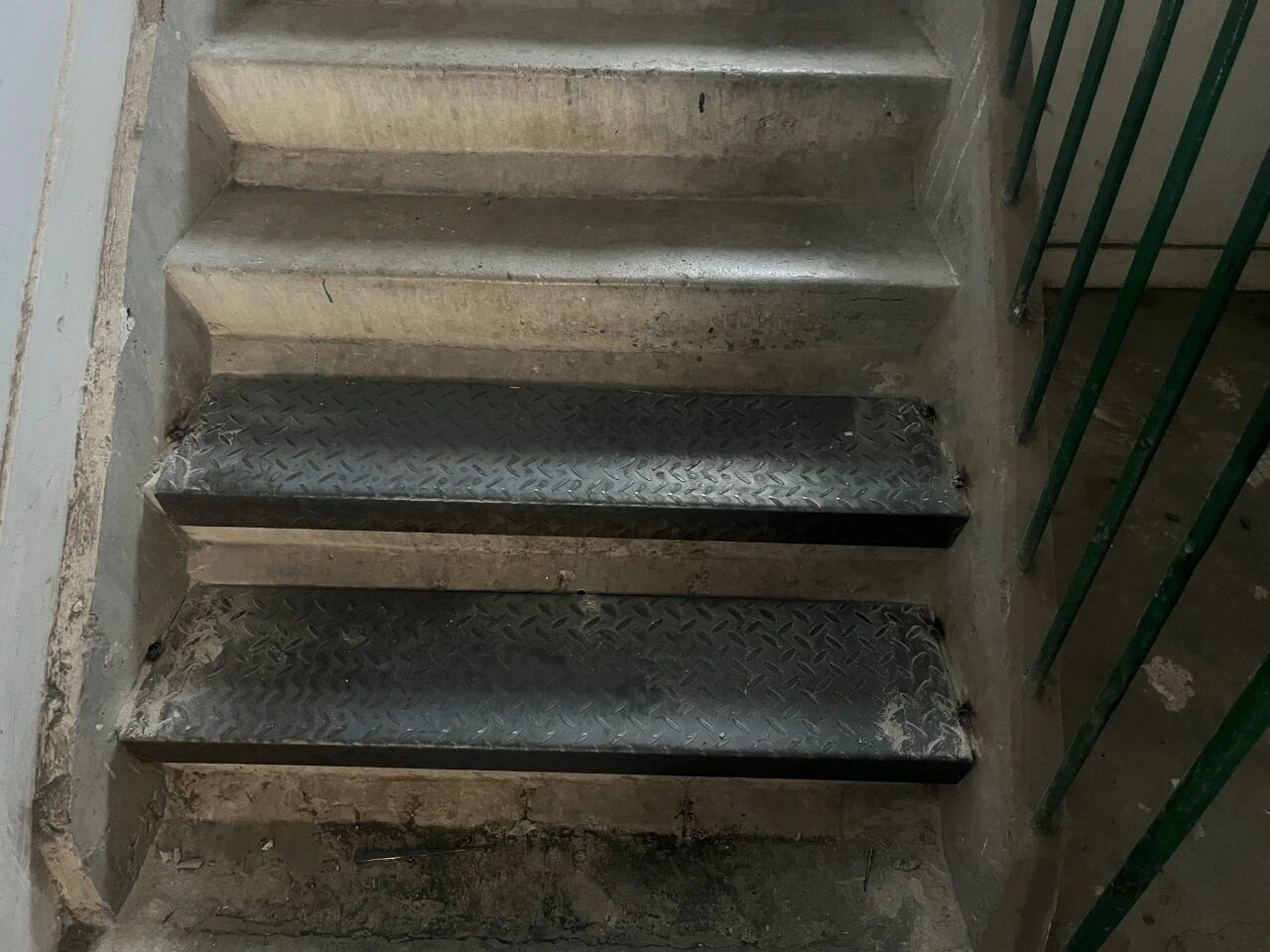 为确保修补效果持久耐用,社区工作人员与维修师傅反复沟通、调整方案,最终确定“加固 + 防护”双重处理方案:先用专业胶水对钢筋外露部位进行加固修补,填补破损缝隙,增强结构稳定性;再定制与台阶尺寸精准匹配的不锈钢板,覆盖在修补后的区域并牢固粘贴 —— 既避免钢筋再次外露,又能提升台阶表面耐磨性,同时不锈钢板边缘经打磨处理,可有效防止刮伤居民。