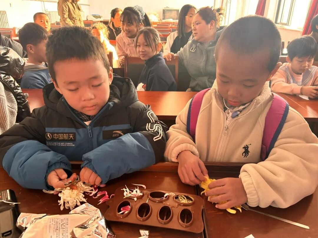 最热闹的当属手工制作环节。孩子们化身小小手艺人,将菊花放入模具盒里,皂基、精油精心调配。从融化皂基到注模定型,每一个步骤都认真专注。孩子们仔细观察皂基定型,当一块块晶莹剔透、嵌着菊花的香皂从模具中取出时,满满的成就感洋溢在一张张笑脸上。