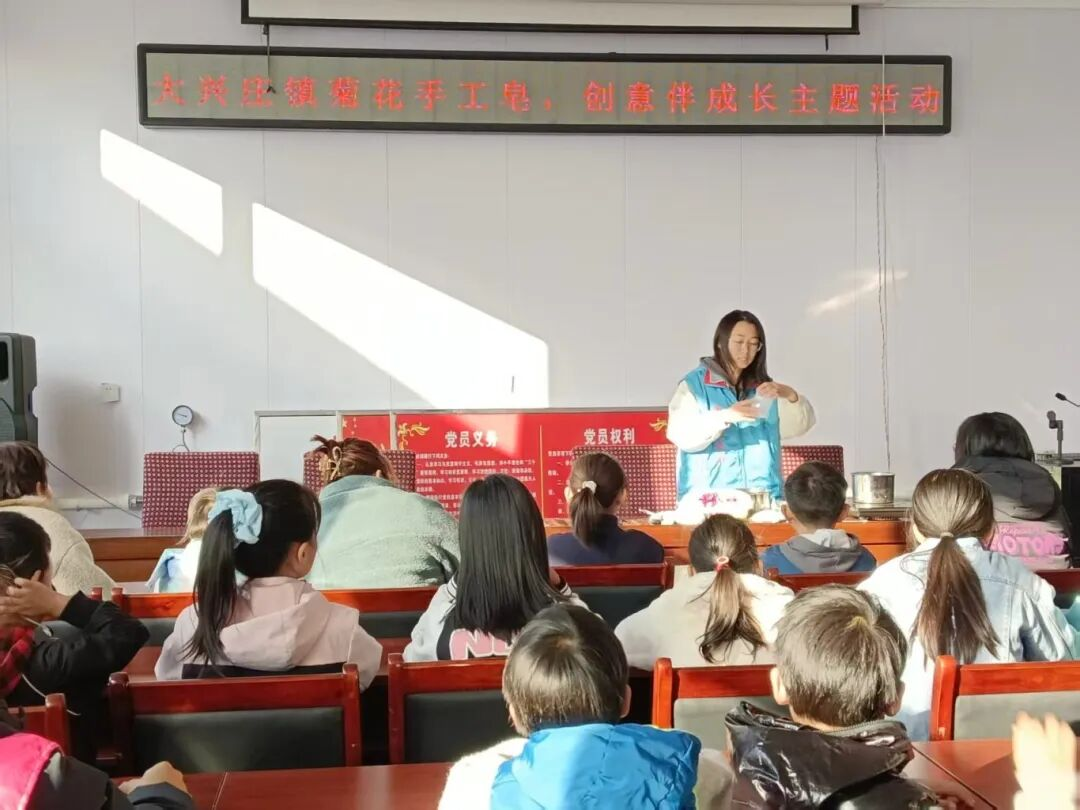 活动在充满诗意的氛围中拉开帷幕。“采菊东篱下,悠然见南山。”村书记以古诗为引,为孩子们讲述了大兴庄镇菊花节的发展历史,从古人的诗词歌赋到现代的园艺盛景,让孩子们领略到菊花文化的源远流长。现场还深入浅出地讲解了菊花的食用与药用价值,从《本草纲目》记载的药用智慧,到清香怡人的菊花茶饮,孩子们听得津津有味。