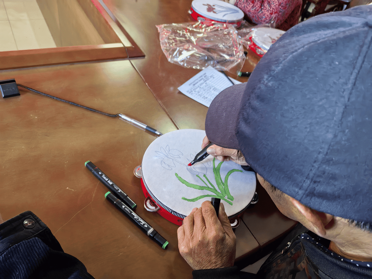手工环节中,参与者手持空白手鼓,用丙烯颜料、画笔、调色盘等材料,发挥创意,在色彩勾勒中加深分类知识记忆,亲手制作的手鼓也成为环保理念的随身“宣传员”。