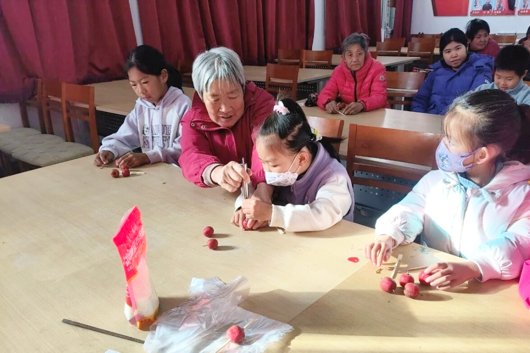 制作环节中,镇团委准备了山楂、白糖及创意食材。志愿者协助老人清洗水果,指导孩子安全操作;老人们熟练串制水果,孩子们则发挥创意搭配。经验丰富的村民指导熬糖技巧,青年志愿者从旁协助。糖葫芦制成后,老人与孩子们互换自己的劳动成果,温情在互动中自然流淌。
