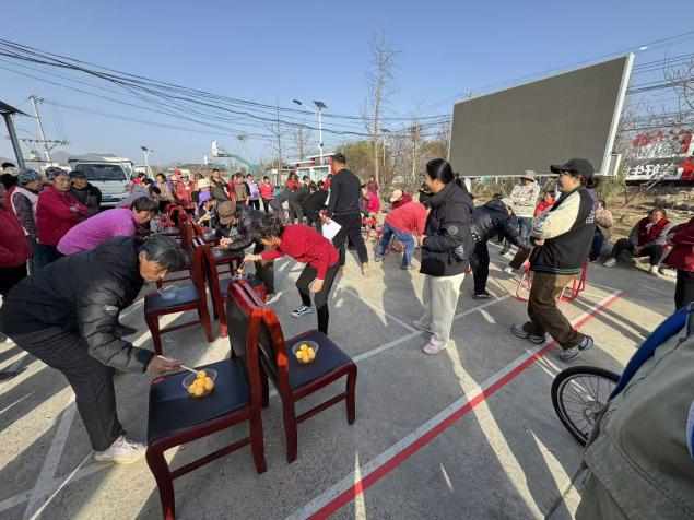 赛场之上不分你我,邻里温情格外暖心,“欢乐夹球接力”“铺石过河”“顶球接力”“气球传杯”“母鸡下蛋”五项趣味游戏轮番上演,欢乐嗨翻全场。头发花白的大爷大妈精神矍铄,手握筷子参与“欢乐夹球接力”,动作虽缓却稳;中青年村民活力四射,在“铺石过河”“顶球接力”中默契配合、冲锋陷阵;小朋友们蹦蹦跳跳当起“小帮手”和“气氛组”,为赛场增添了无限童真。大家互帮互助,递热茶、扶长辈、喊加油,简单举动里满是浓浓乡情,让文化广场变成温暖的“大家庭”聚会现场。