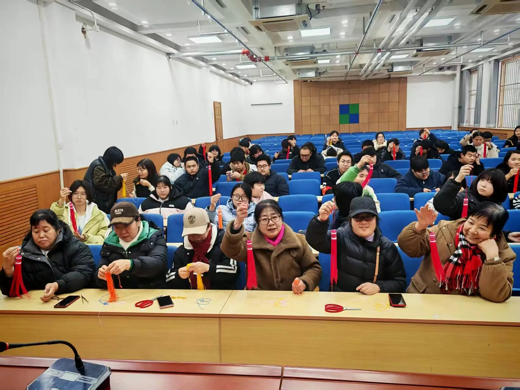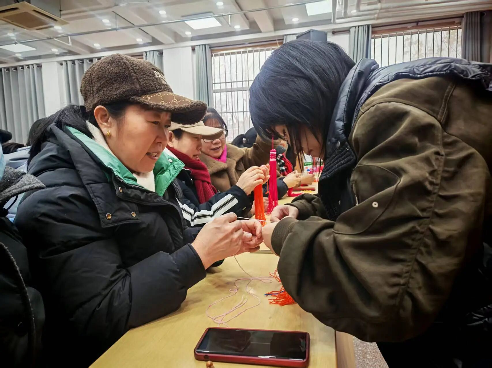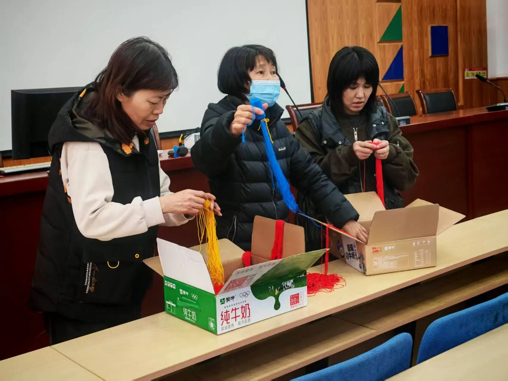 培训现场,区非物质文化遗产灯彩传承人陈学军、杨欣老师,向学员细致讲解灯彩流苏的发展历史、技艺特点及编织手法。学员们认真学习、用心实践,在两位老师精心指导下快速掌握编织技巧,相互展示学习成果、交流心得,现场氛围热烈。