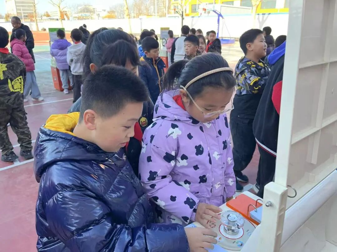 室内讲座结束后,学生们来到室外大篷车展区,这里装满了各种新奇有趣的科普展品,涵盖声、光、电、磁等多个知识领域。同学们认真聆听讲解,有序参观体验。从有趣的声光反应测试到触摸与感受的游戏,从静电乒乓球到磁力传动摆,每一个互动展品都引发了阵阵惊叹和热烈讨论。大篷车内的科学奇迹不仅让学生们亲手触摸到知识的魅力,更激发了他们对未知世界的好奇心和探索欲。