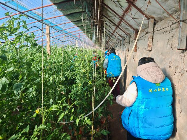 采摘开始!学员们兴致勃勃地投入其中。他们小心翼翼地拨开叶子,寻找着那一颗颗饱满鲜红的果实,动作从生涩到熟练,脸上洋溢着专注与喜悦。遇到行动不便的伙伴,大家主动援手——你扶藤蔓、我摘高处果实,默契协作让大棚洋溢着温情欢笑。