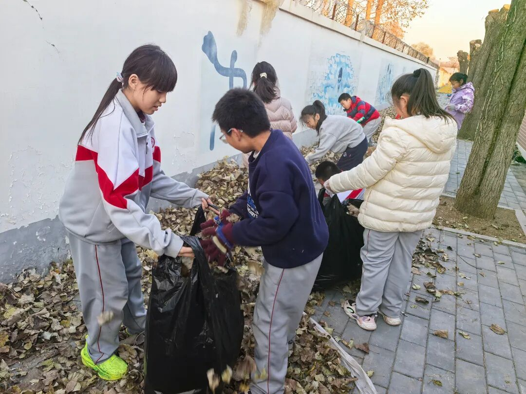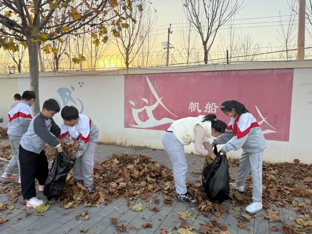 他们三五成群,有的用力挥舞着大扫帚,将堆积的落叶汇集成一座座“小山”;有的负责撑开垃圾袋,默契配合;汗水夹杂着欢笑,现场一派热火朝天的景象。