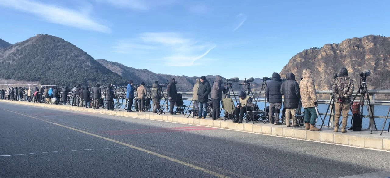 零下的寒气刺骨,西峪水库大桥上却已是一片静谧的“战场”。三脚架林立,镜头在朦胧晨曦中泛着幽光。数百位摄影爱好者裹着厚厚的羽绒服,呼出的白气瞬间凝结,却无人退却。他们低声交流着拍摄参数,眼神始终追随着水库上空的动静,生怕错过任何一个精彩瞬间。