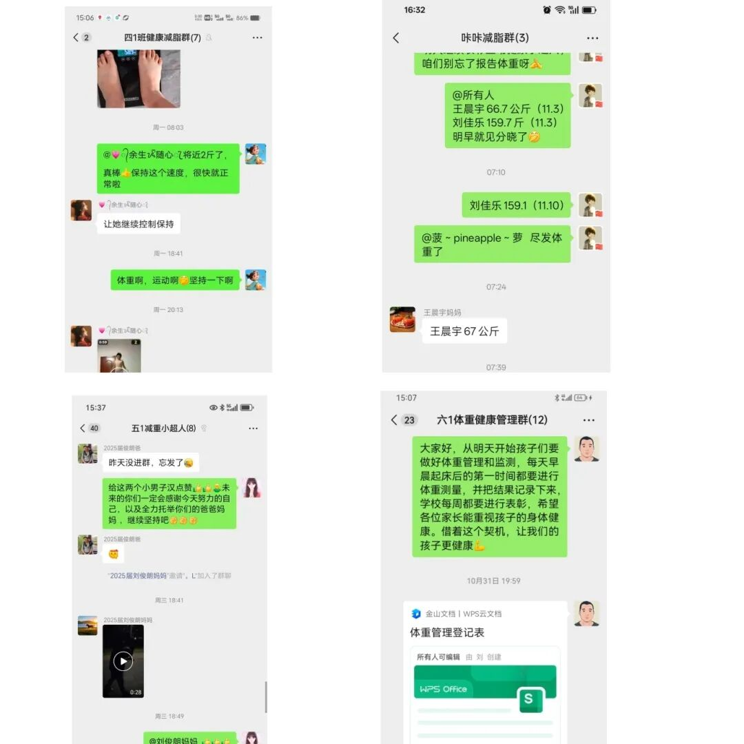 为实时掌握减重进度,学校制定了三重监测机制。一是每日家庭体重监测记录,由家长协助孩子记录体重变化,及时调整饮食与运动计划。二是每周学校体重测量,由老师统一记录数据,激励学生在减重行动中始终保持信心。三是每双周由家长向所在社区(村)网格员反馈孩子体重数据,动态跟踪每位学生的减重效果。此外,学校每周对学生的体重进行监测分析,每个班级均建立“班级减重群”,家长们在群里分享孩子的减重实践,从“今天少吃了一碗米饭”到“和爸爸一起跑了3公里”,将孩子减重路上的经验做法在群里一一呈现;班主任作为第一责任人,每天关注群内动态,分享科学的减重方法,及时给予鼓励,对遇到困难的家庭提供针对性建议,让减重路上无人“掉队”。