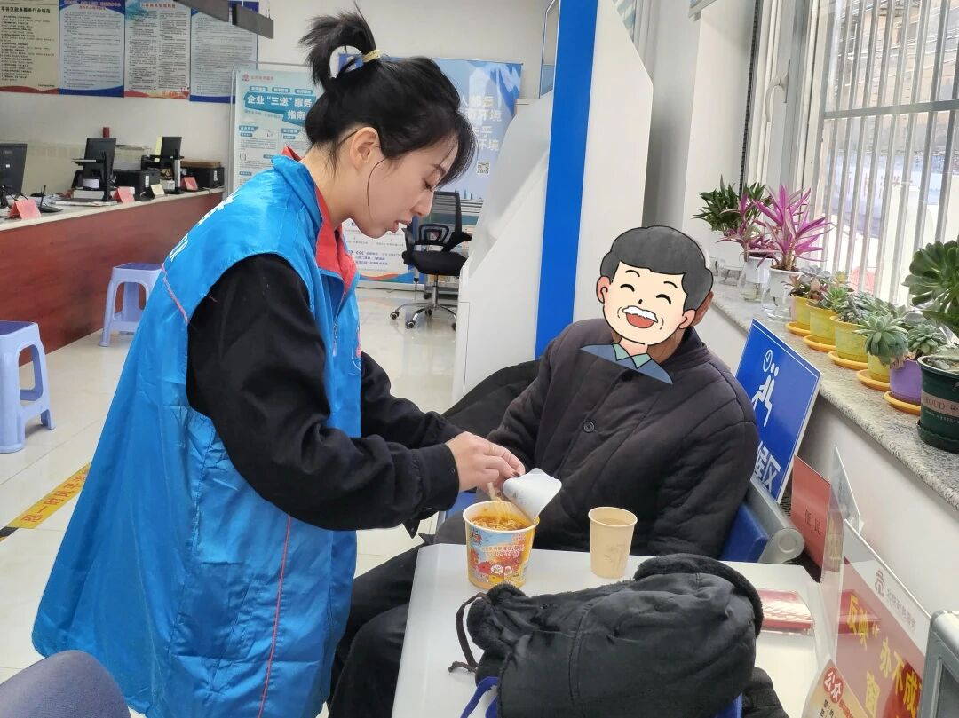 2025年12月3日中午12时15分,年事已高、行动不便的郭先生(化名)因家庭纠纷,独自乘坐公交车来到南独乐河镇便民服务中心求助。由于年事已高且行动不便,老人神情焦虑、体力不支,工作人员第一时间察觉,细致询问之下得知,老人一早出门至今未进午饭,当即放下手中事务,为老人递上温热的开水和热气腾腾的泡面,耐心安抚着老人情绪。