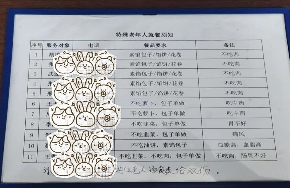 “胡奶奶、张奶奶不吃肉,聂阿姨血糖高要低糖,邹奶奶不吃韭菜,包子要单做”…… 驿站的餐单上,记满了老人们的饮食偏好。结合老人饮食习惯制定的个性化餐单,兼顾低糖、低脂、易咀嚼,每餐荤素搭配、营养均衡,还能根据特殊需求调整菜品。志愿者们根据需要入户送餐,让行动不便的老人也能吃上热乎饭,这一口饭菜里,藏着驿站的用心,更暖着老人们的心。